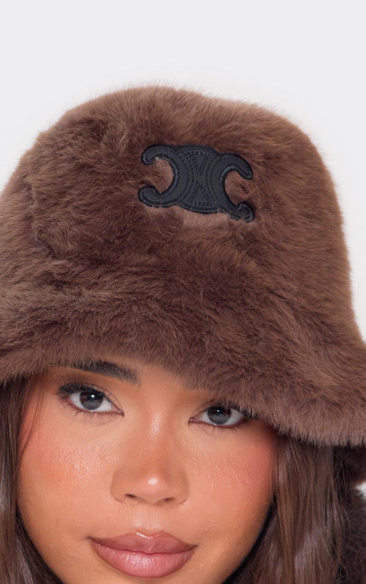 Contrast Logo Detail Bucket Hat In Brown Faux Fur