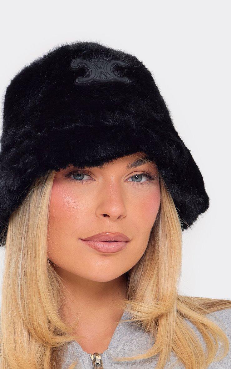 Logo Detail Bucket Hat In Black Faux Fur