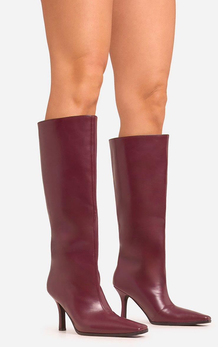 Outstanding Pointed Toe Knee High Heeled Boot In Burgundy Faux Leather