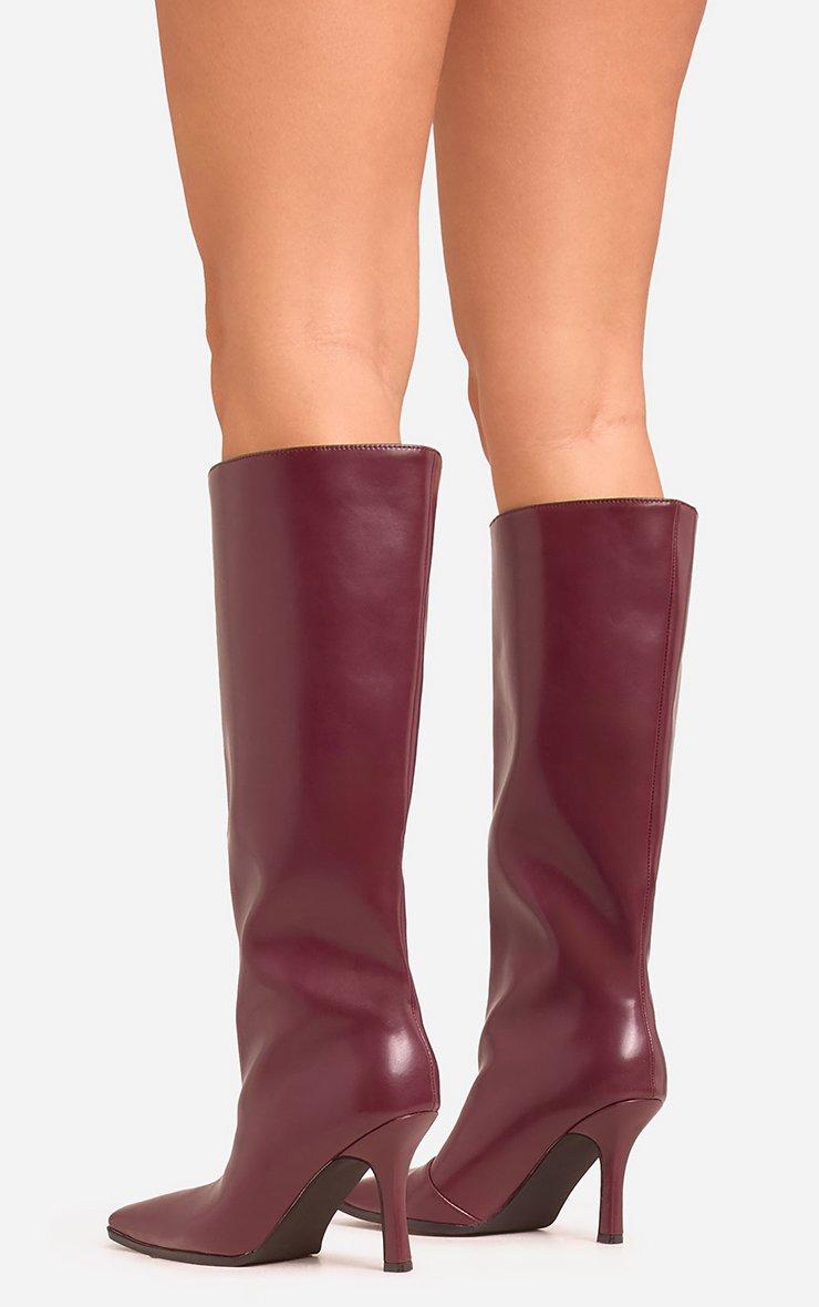 Floor-It Pointed Toe Knee High Heeled Boot In Burgundy Faux Leather