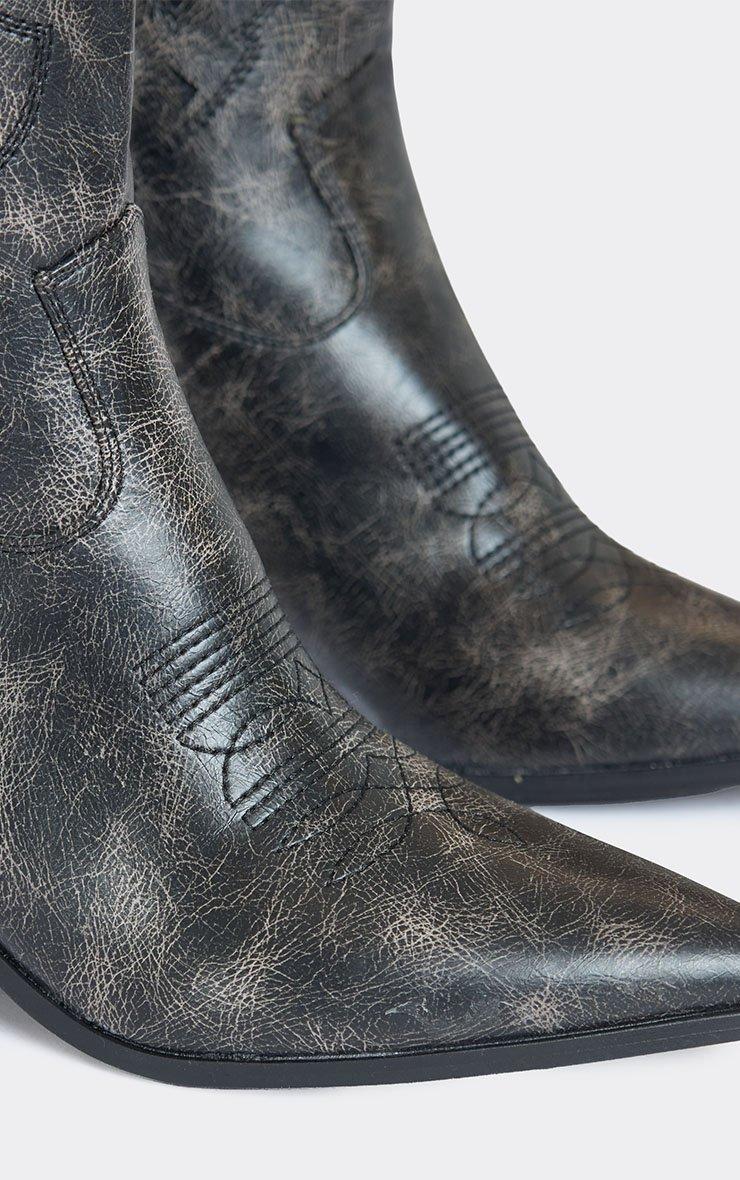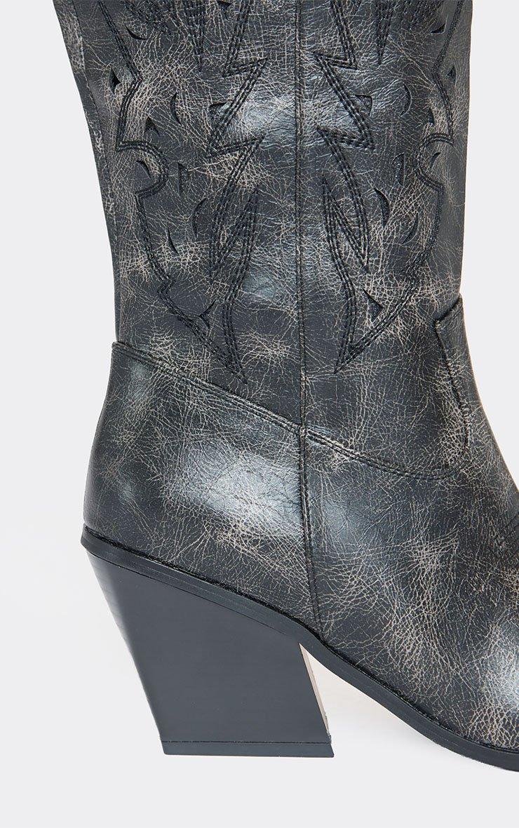 misty embroidered laser detail pointed toe knee high western cowboy boot in black washed faux leather