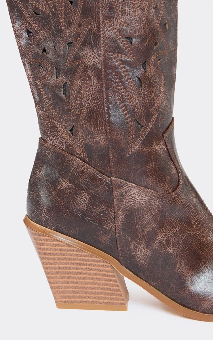 misty embroidered laser detail pointed toe knee high western cowboy boot in brown washed faux leather