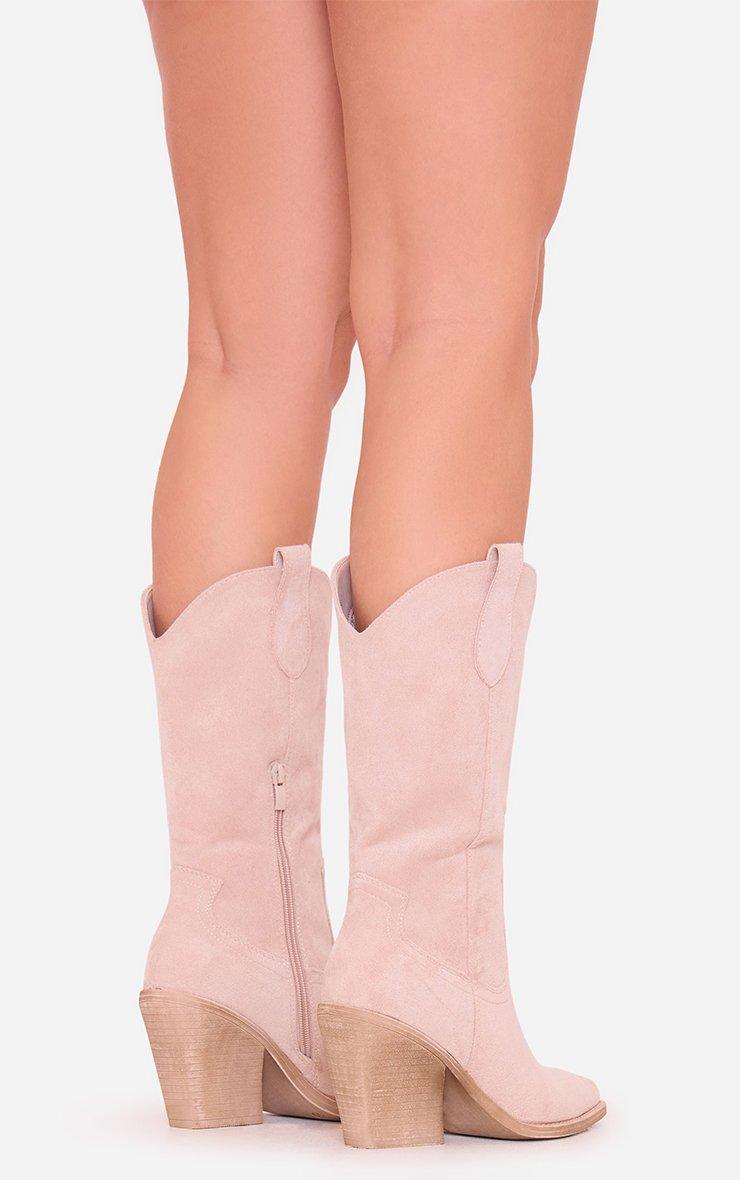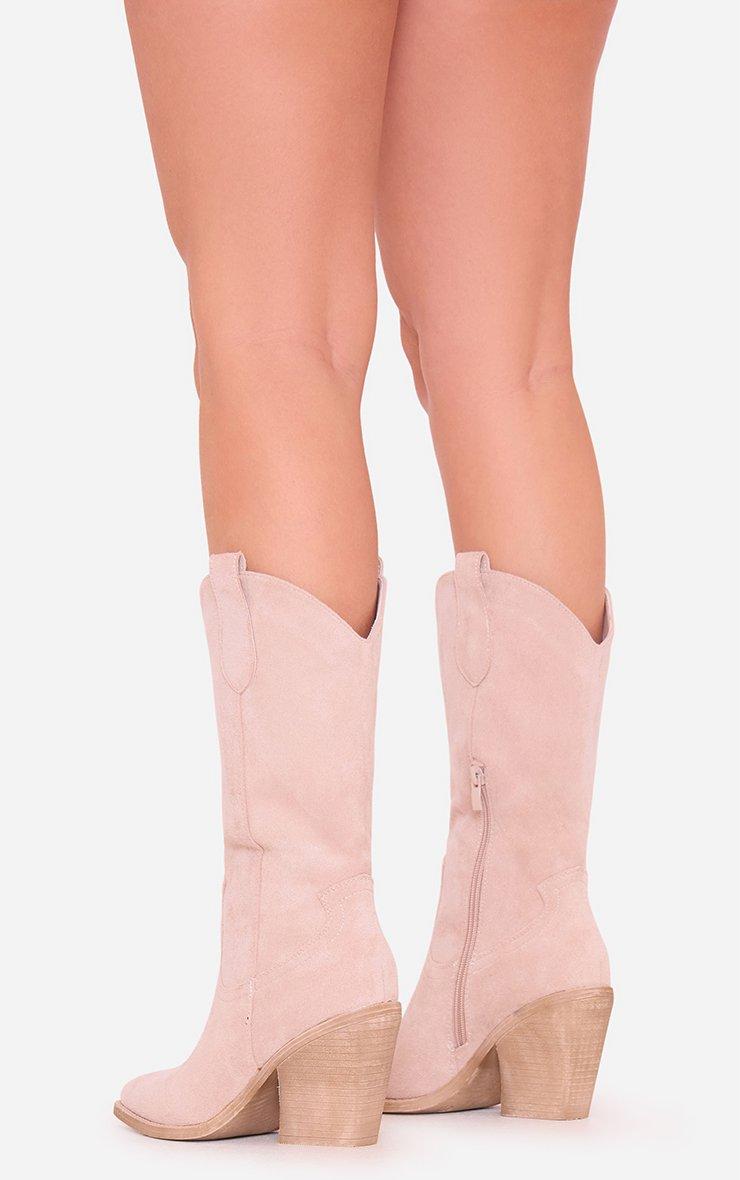 Roxer Embroidered Detail Pointed Toe Mid Calf Western Cowboy Boot In Nude Faux Suede
