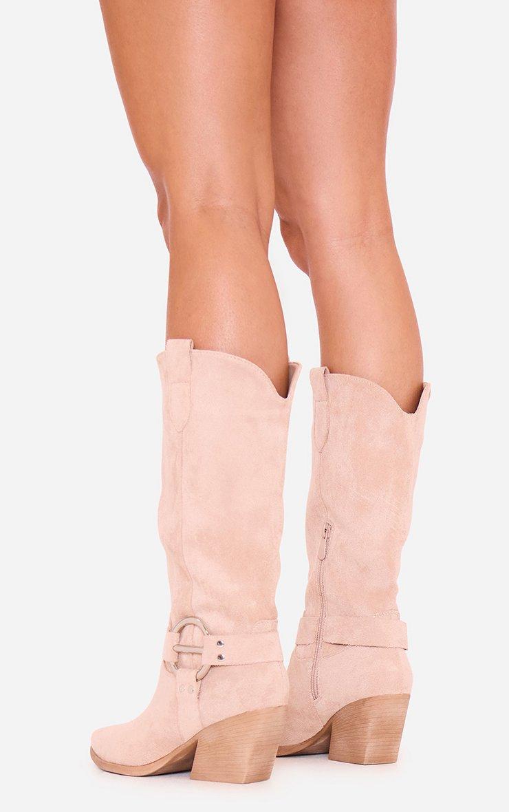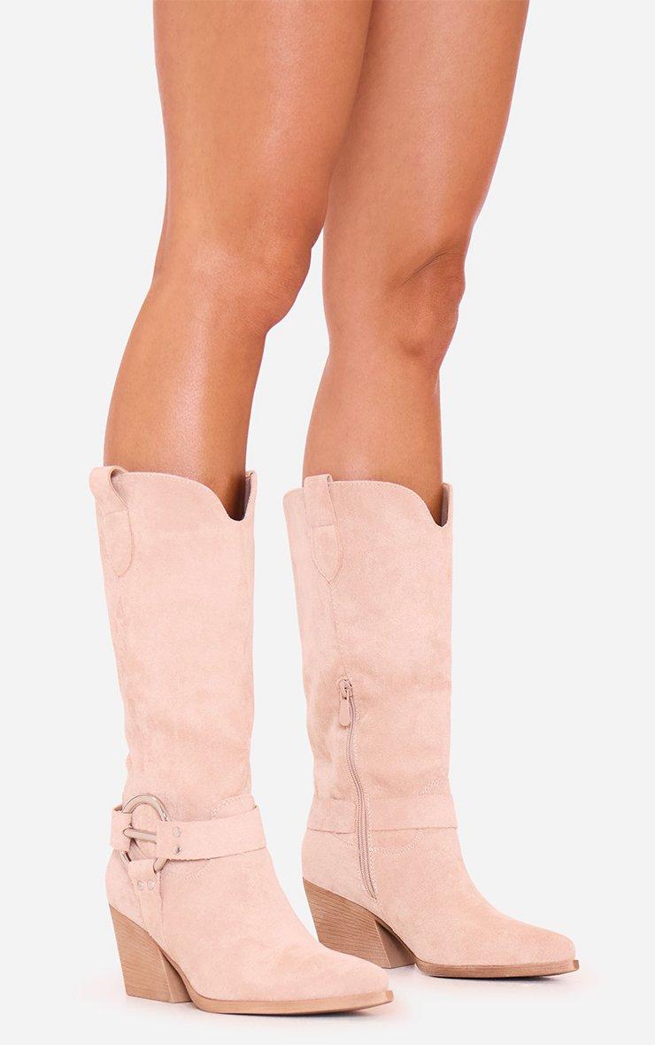 Denver Side Ring Detail Pointed Toe Mid Calf Western Cowboy Boot In Beige Faux Suede