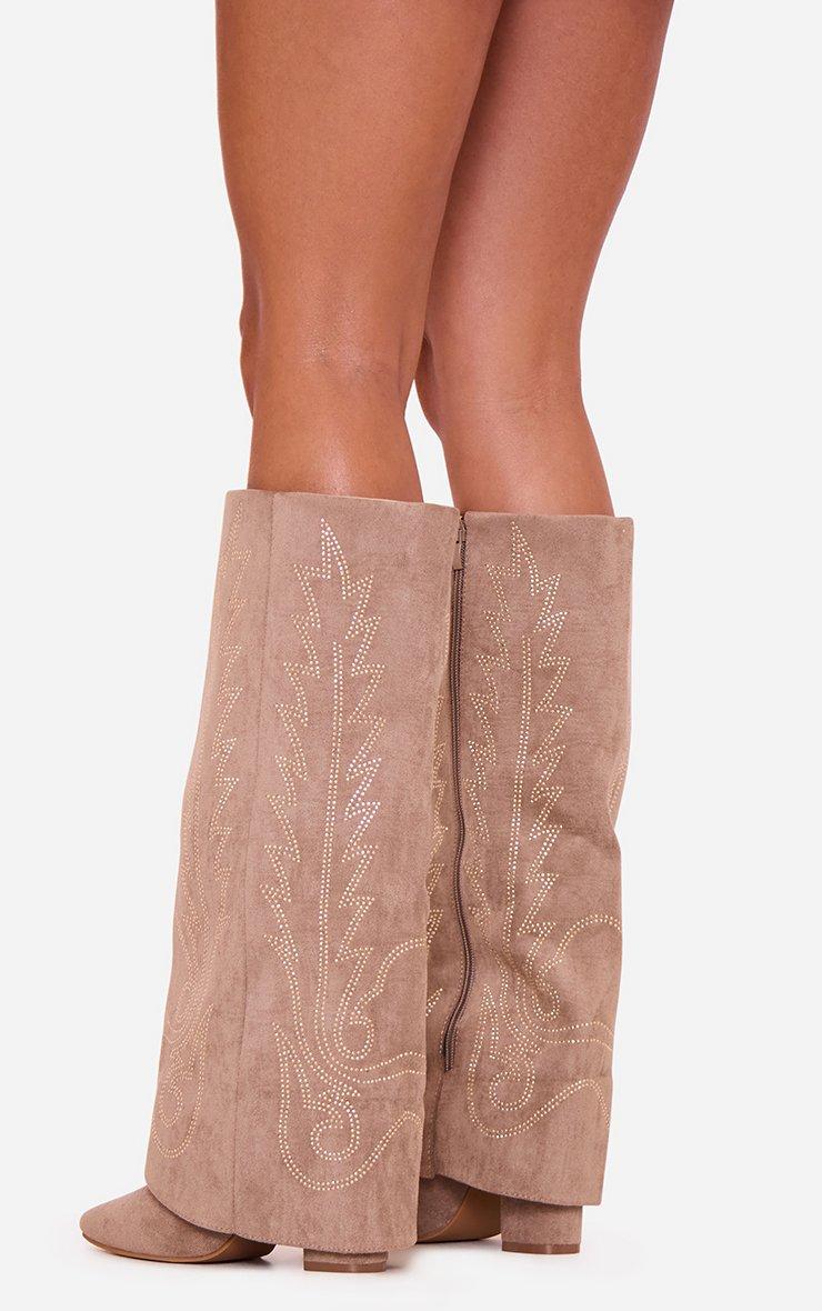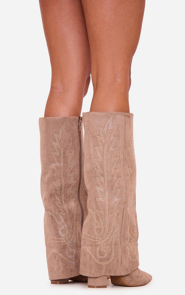 Suzzee Diamante Embroidered Detail Pointed Toe Layered Knee High Long Boot In Taupe Faux Suede