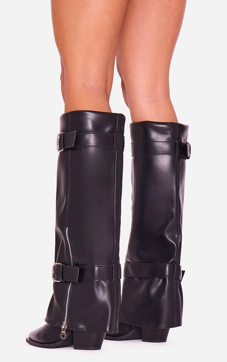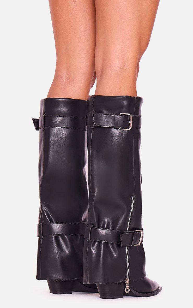 Mona Buckle Detail Knee High Boot In Black Faux Leather