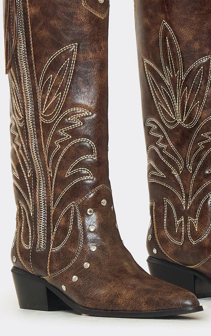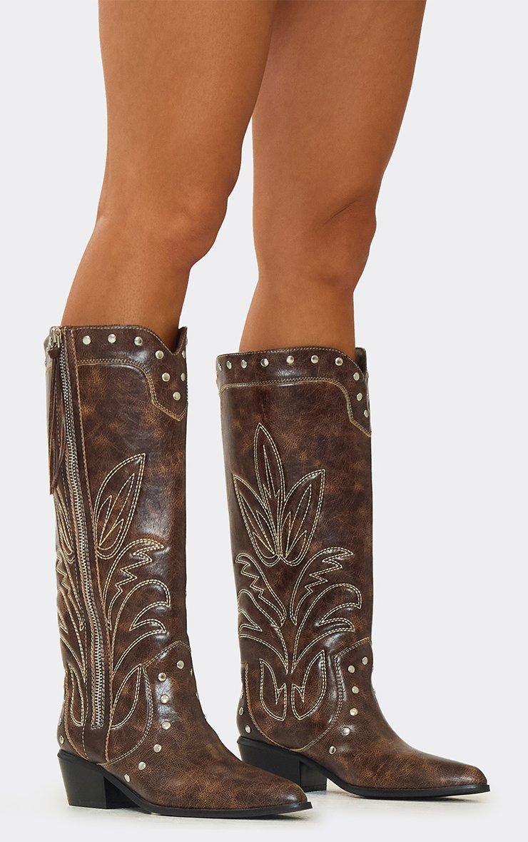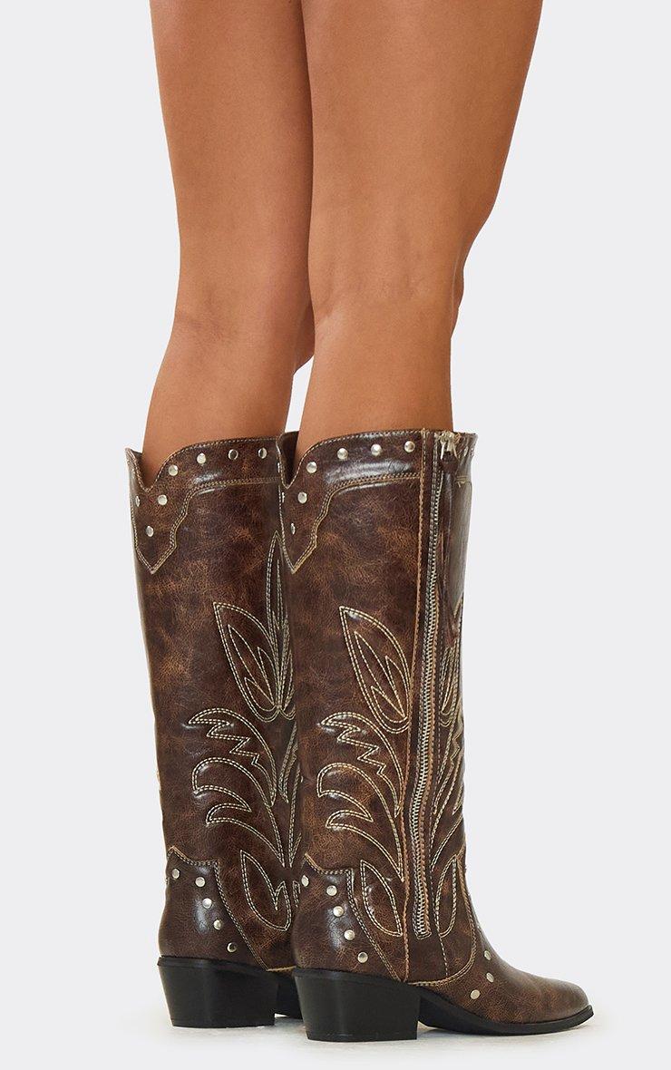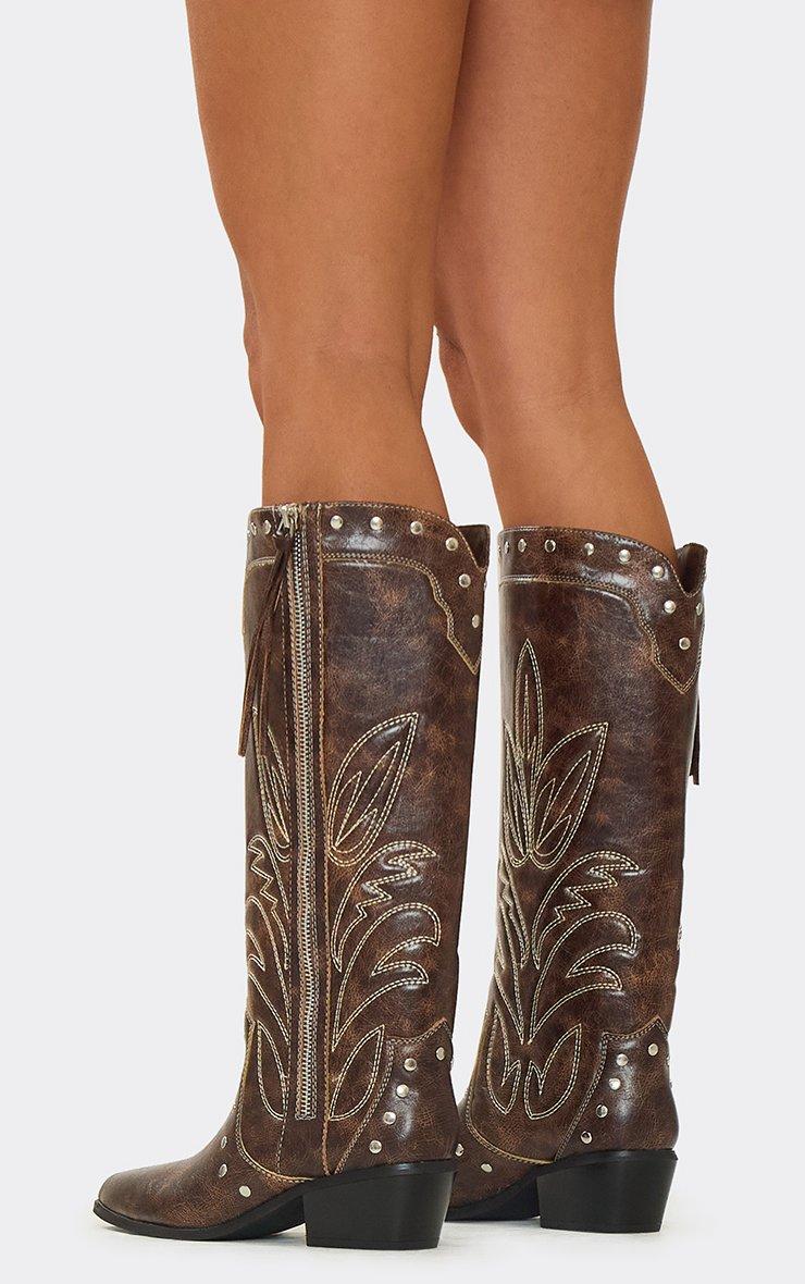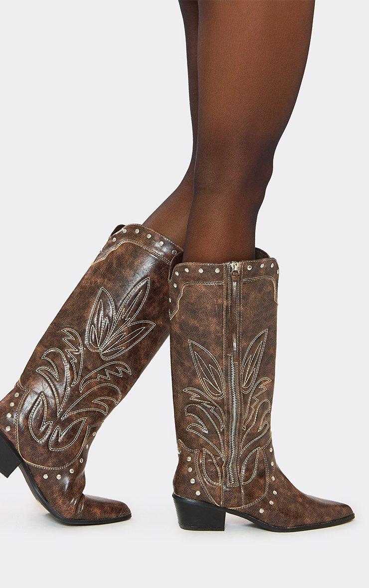 austin embroidered stud detail pointed toe knee high western cowboy print in distressed brown faux leather