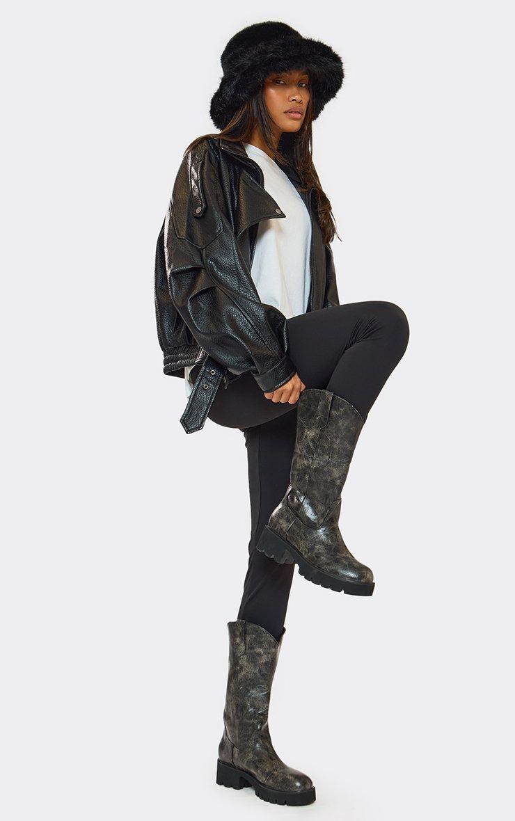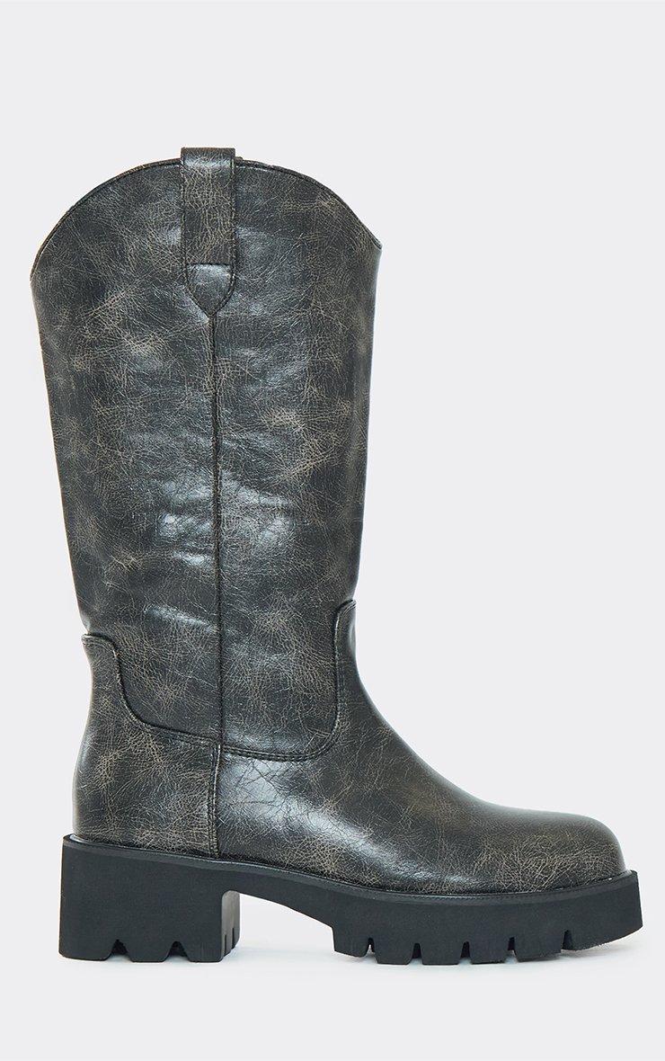 Seriously Chunky Sole Mid Calf Western Biker Boot In Distressed Black Faux Leather