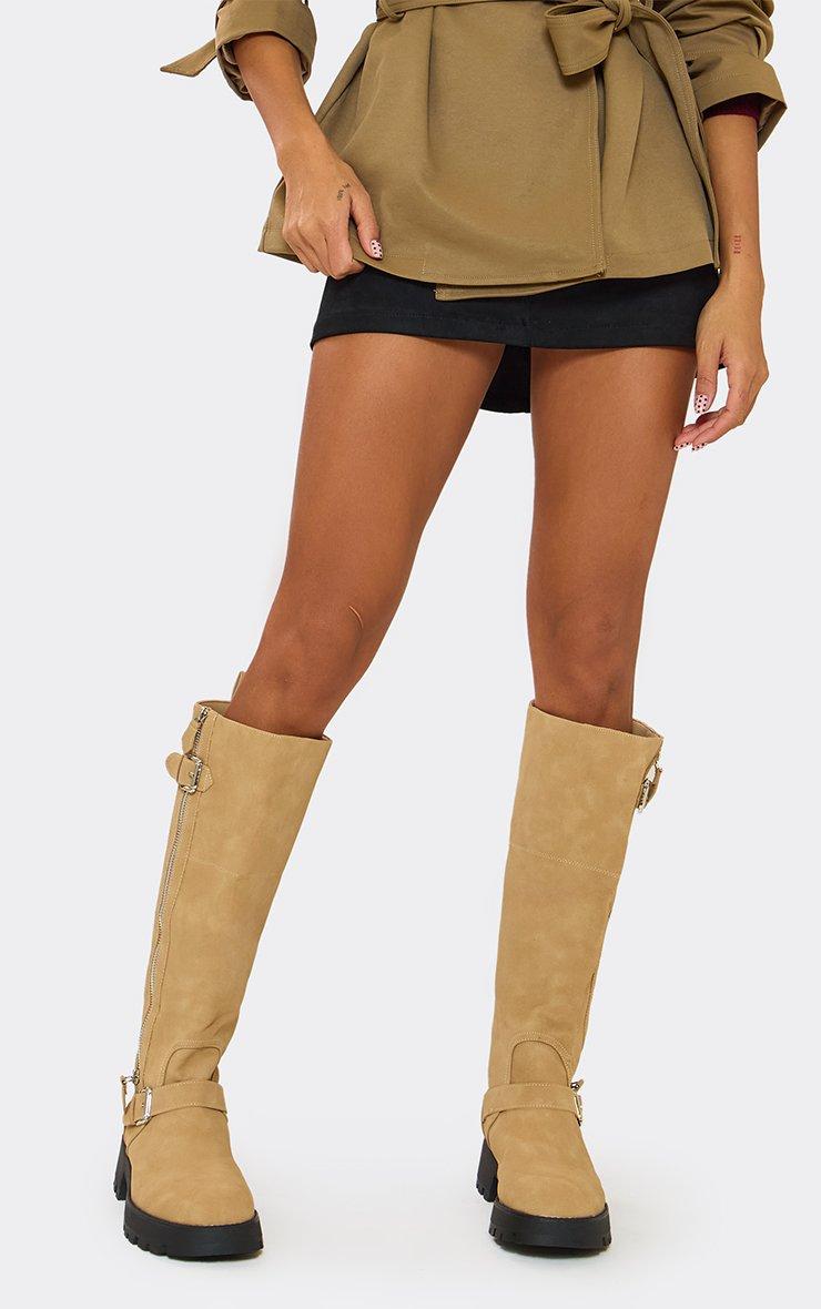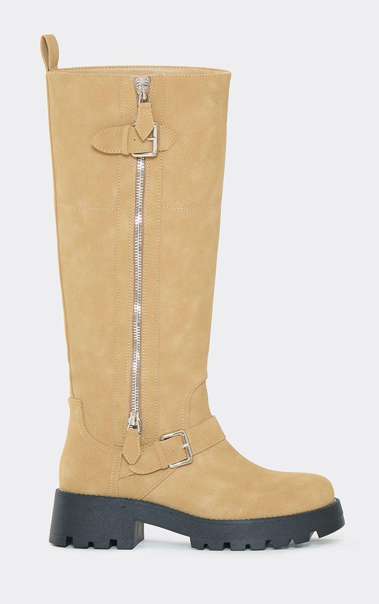 Jamming Zip Buckle Zip Detail Knee High Biker Boot In Beige Faux Suede
