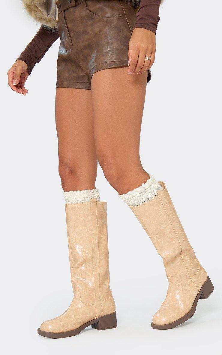 Bunny Chunky Sole Knee High Long Biker Boot In Beige Faux Suede