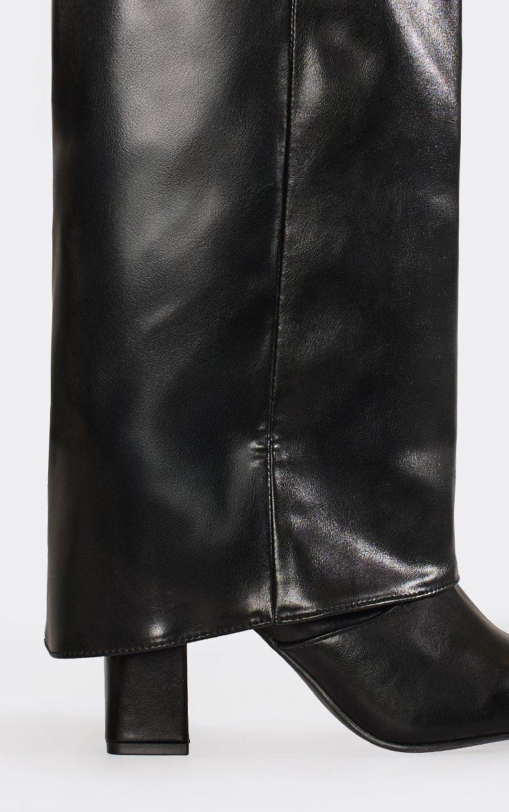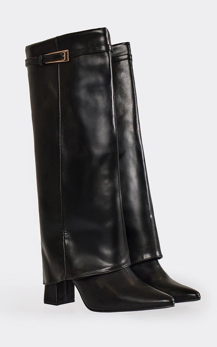 Zadi Lock Layered Detail Pointed Toe Block Heel Knee High Long Boot In Black Faux Leather