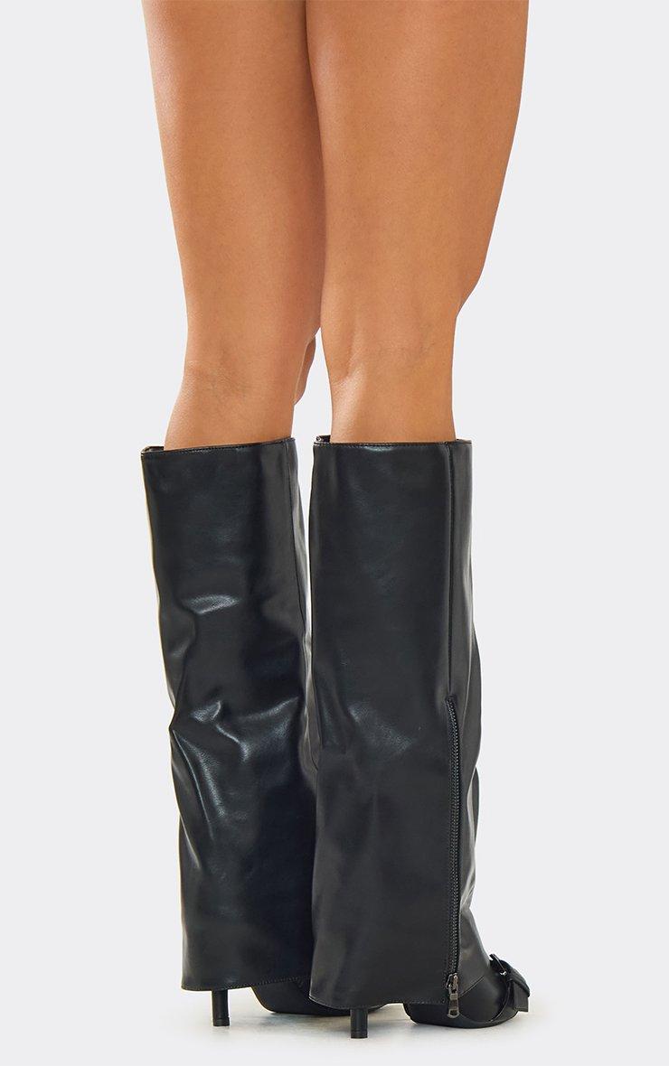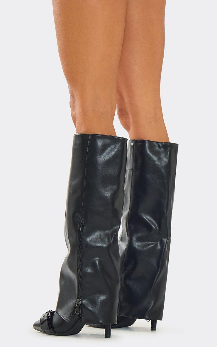Mona Buckle Detail Knee High Boot In Black Faux Leather