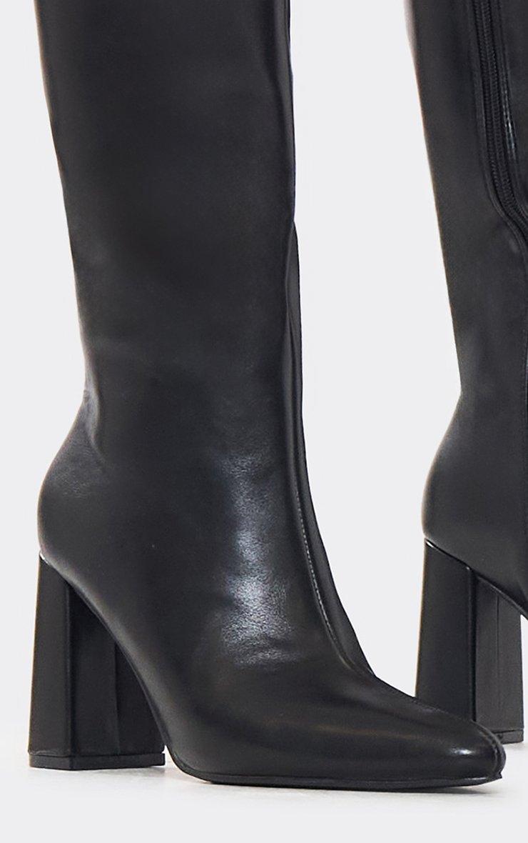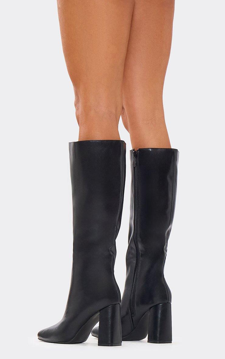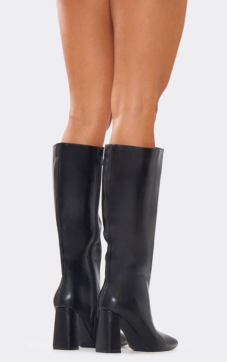 Bernice Square Toe Block Heel Knee High Boot In Black Faux Leather