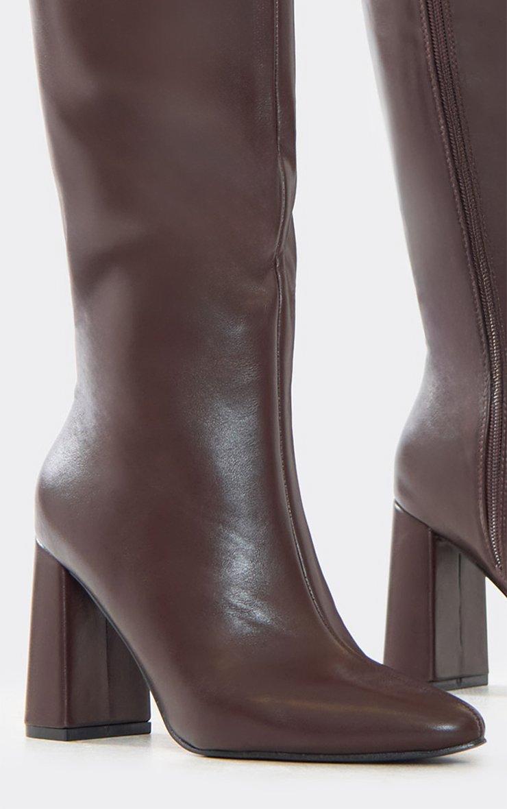 Caesar Chunky Block Heel Knee High Long Boot In Brown Faux Leather