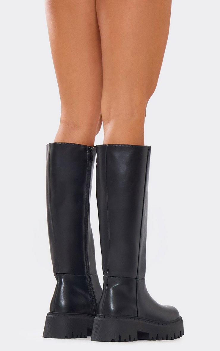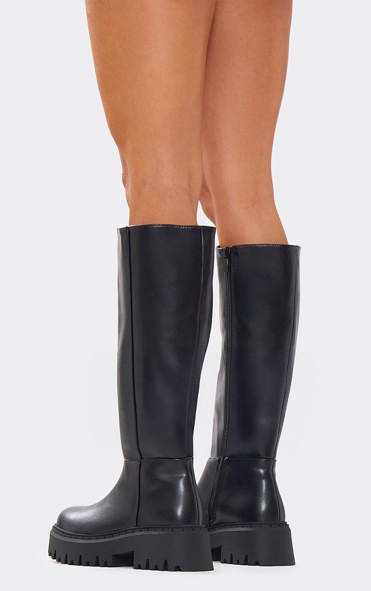 Peach Chunky Sole Knee High Long Biker Boot In Black Faux Leather