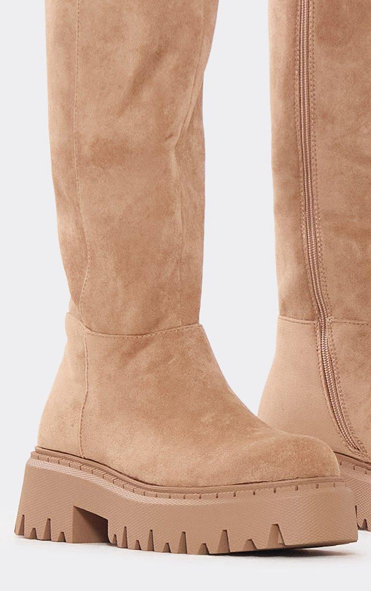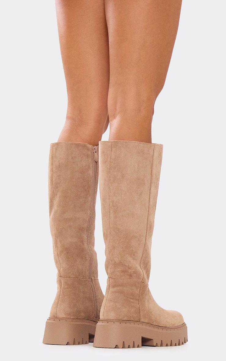 Bunny Chunky Sole Knee High Long Biker Boot In Beige Faux Suede