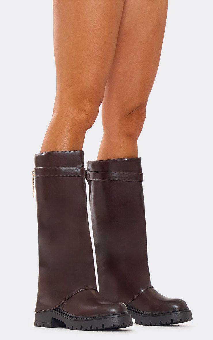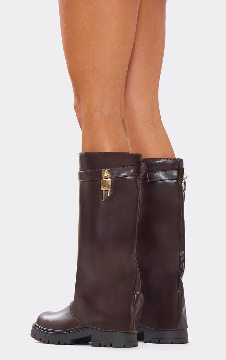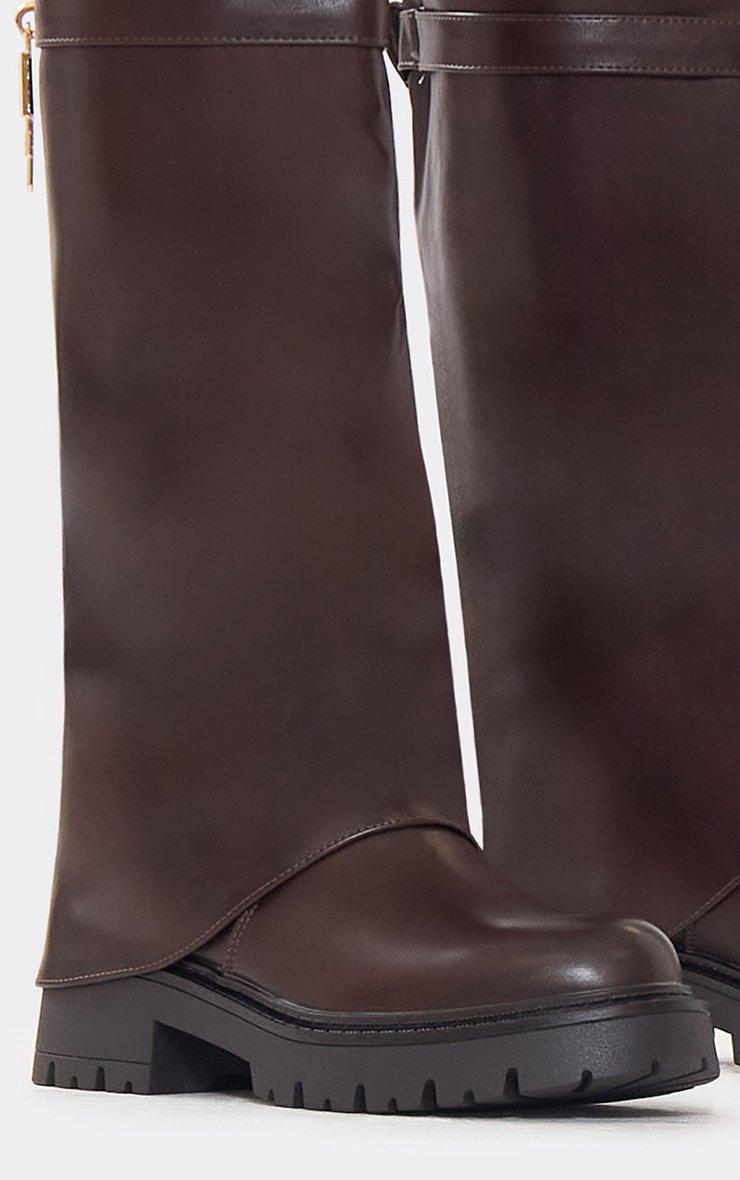 Doll Lock Layered Detail Chunky Sole Knee High Biker Boot In Brown Faux Leather