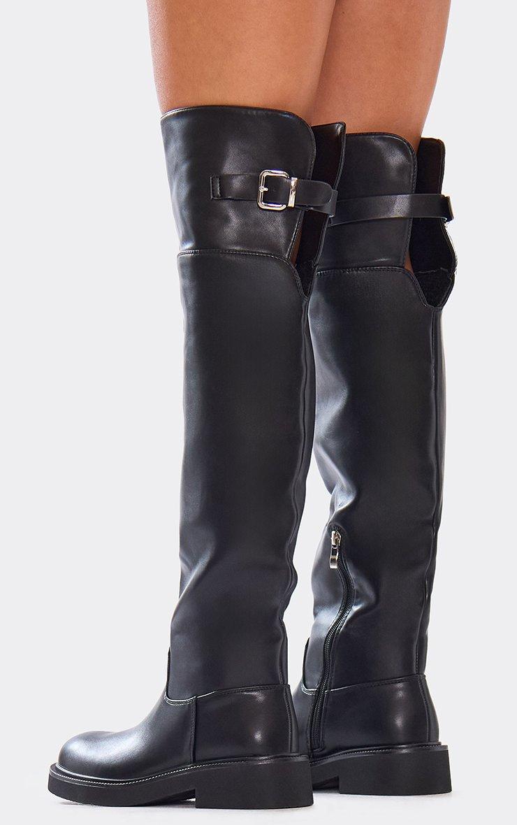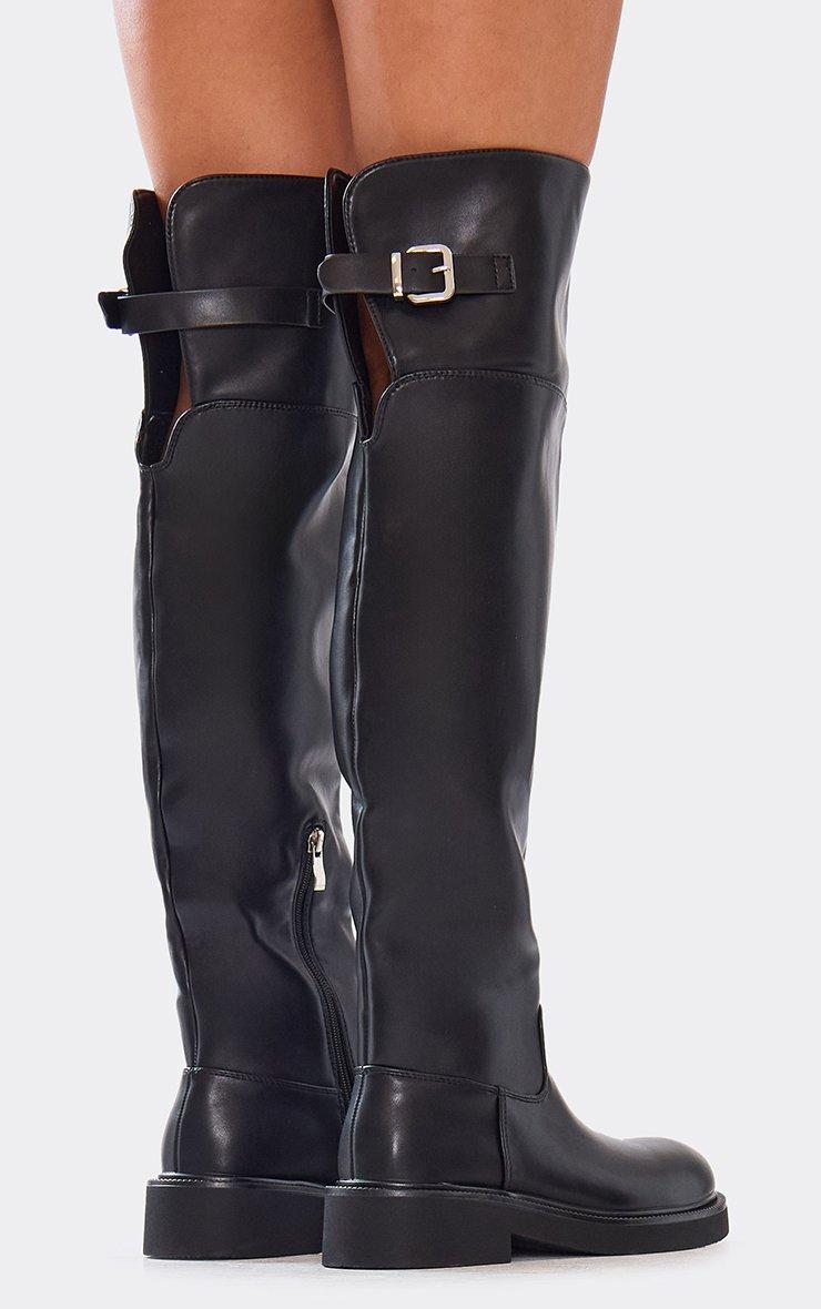 Dasher Back Buckle Detail Over The Knee Thigh High Boot In Black Faux Leather