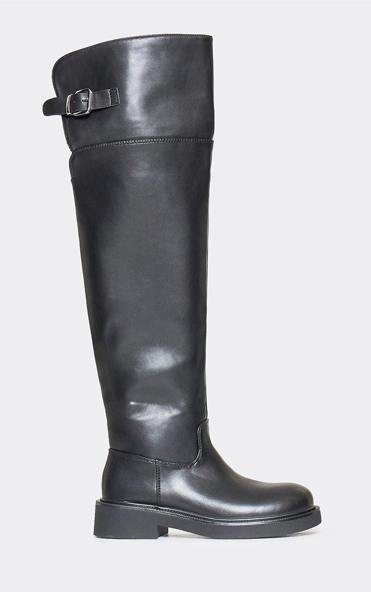 Mona Buckle Detail Knee High Boot In Black Faux Leather