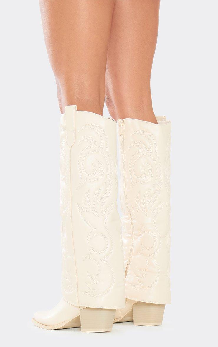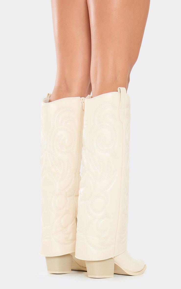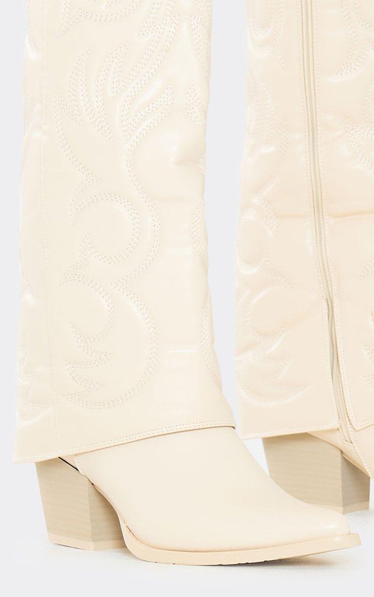 Charmer Embroidered Layered Detail Pointed Toe Knee High Western Cowboy Boot In White Faux Leather