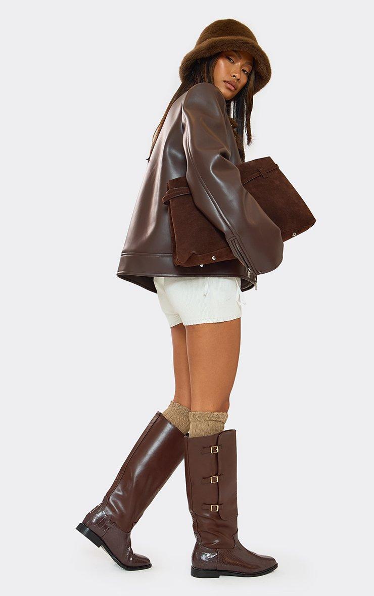 Mona Buckle Detail Knee High Boot In Brown Faux Leather