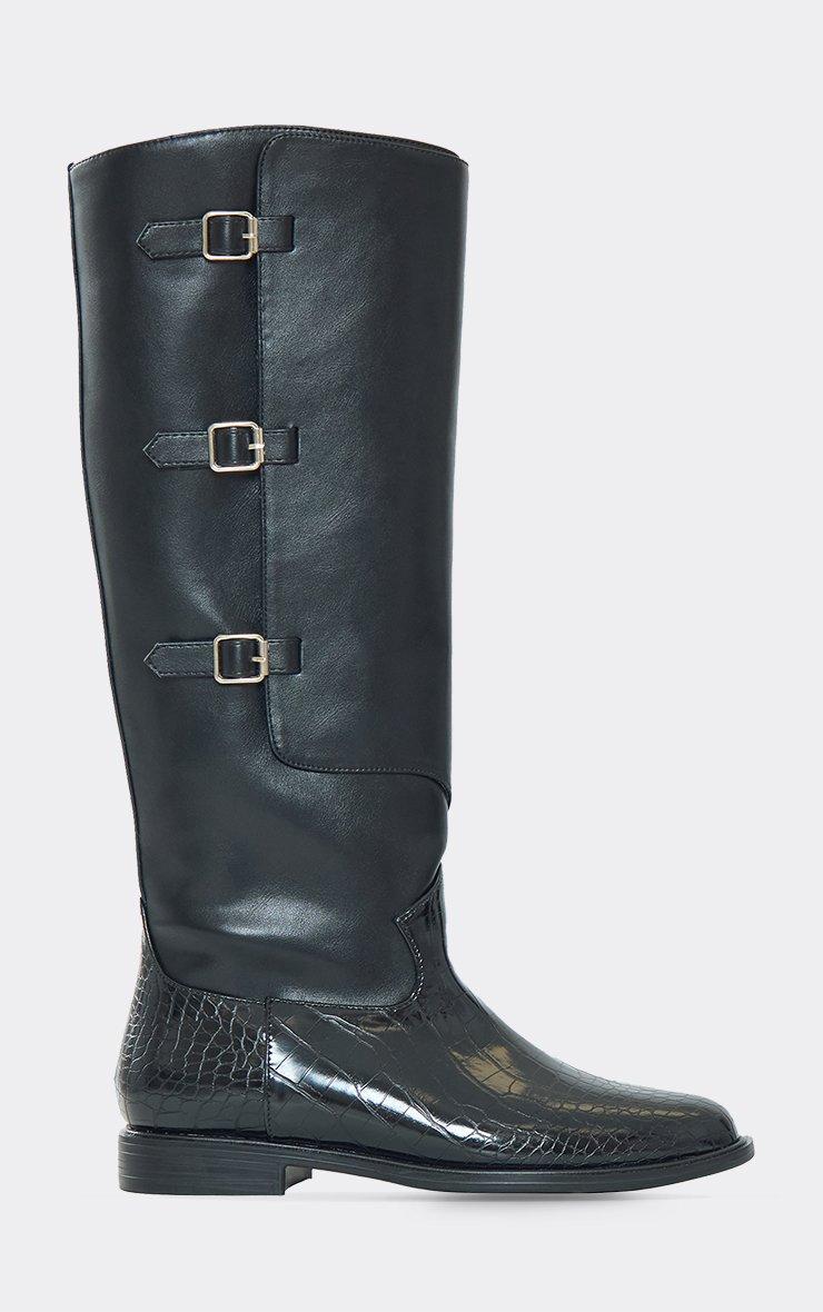 Bernice Square Toe Block Heel Knee High Boot In Black Faux Leather