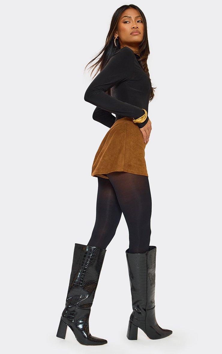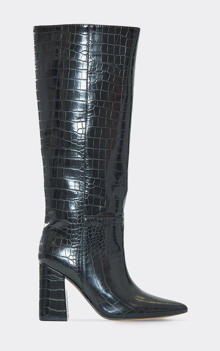 Snapper Pointed Toe Block Heel Knee High Boot In Black Croc Print Faux Leather