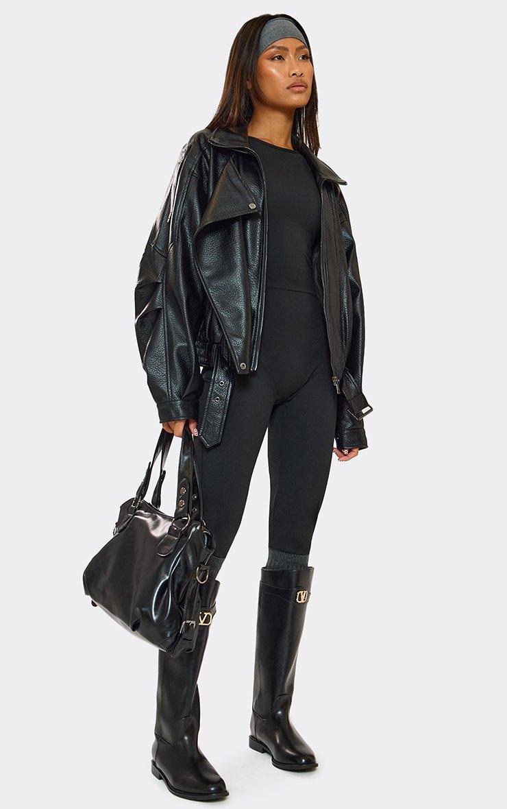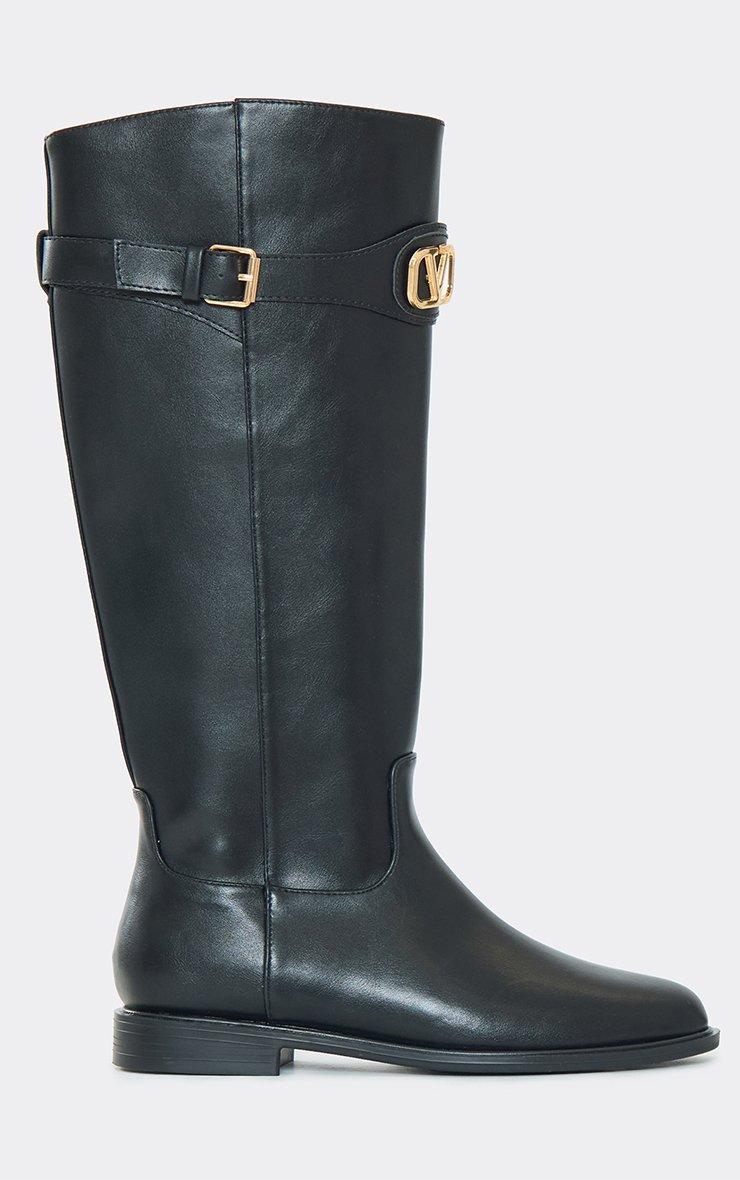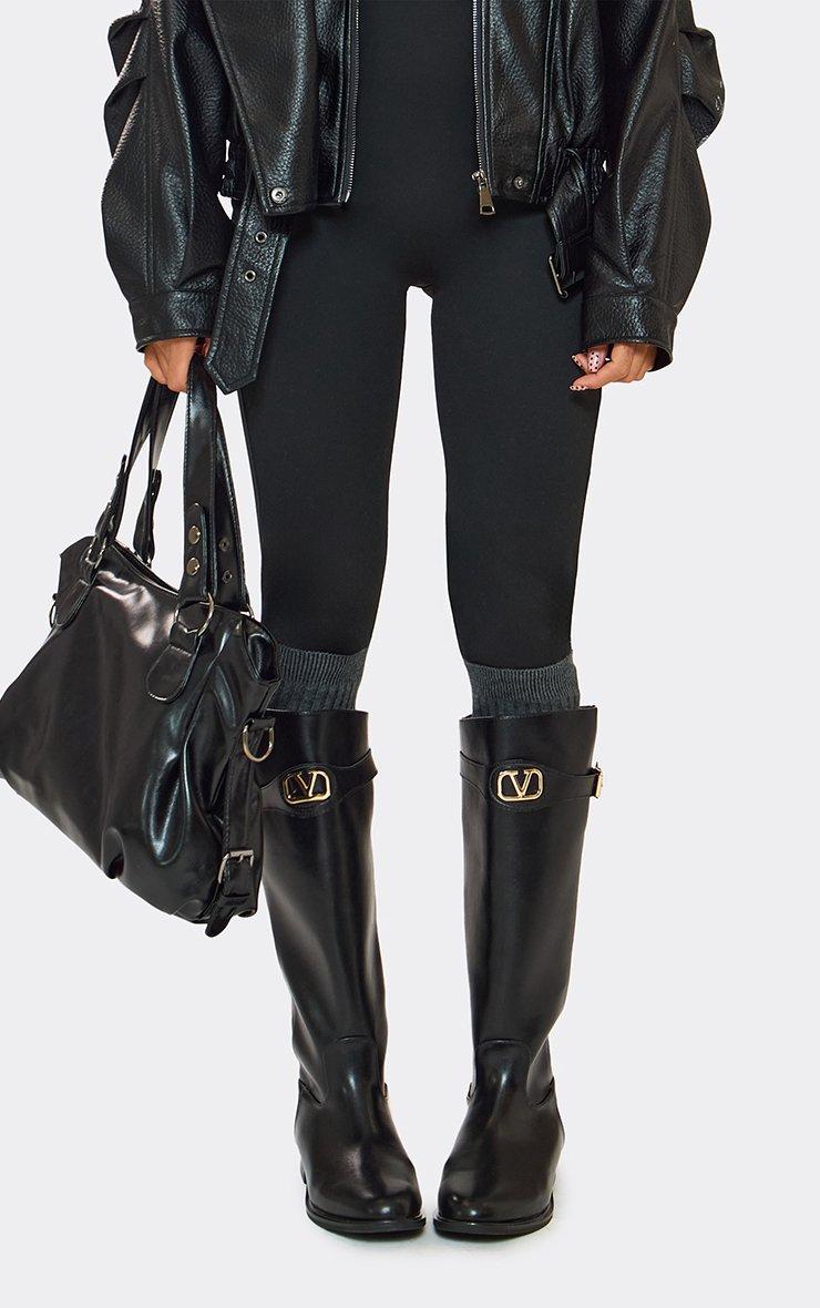 Mona Buckle Detail Knee High Boot In Black Faux Leather