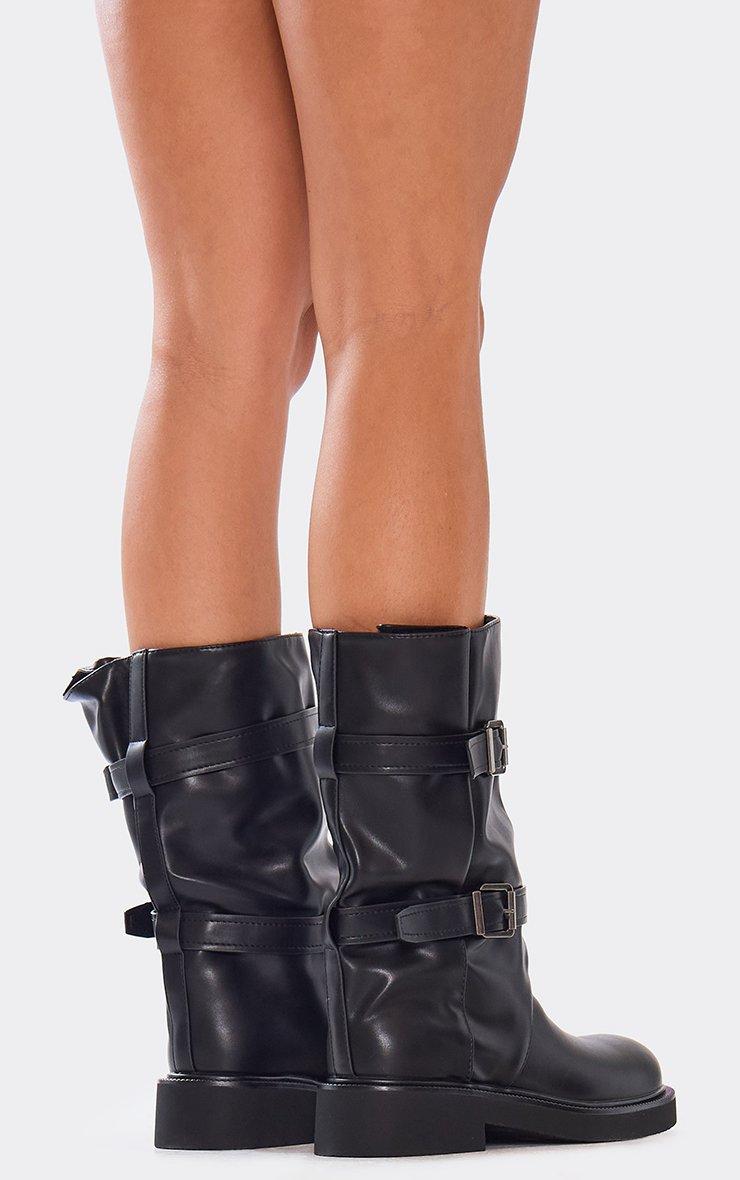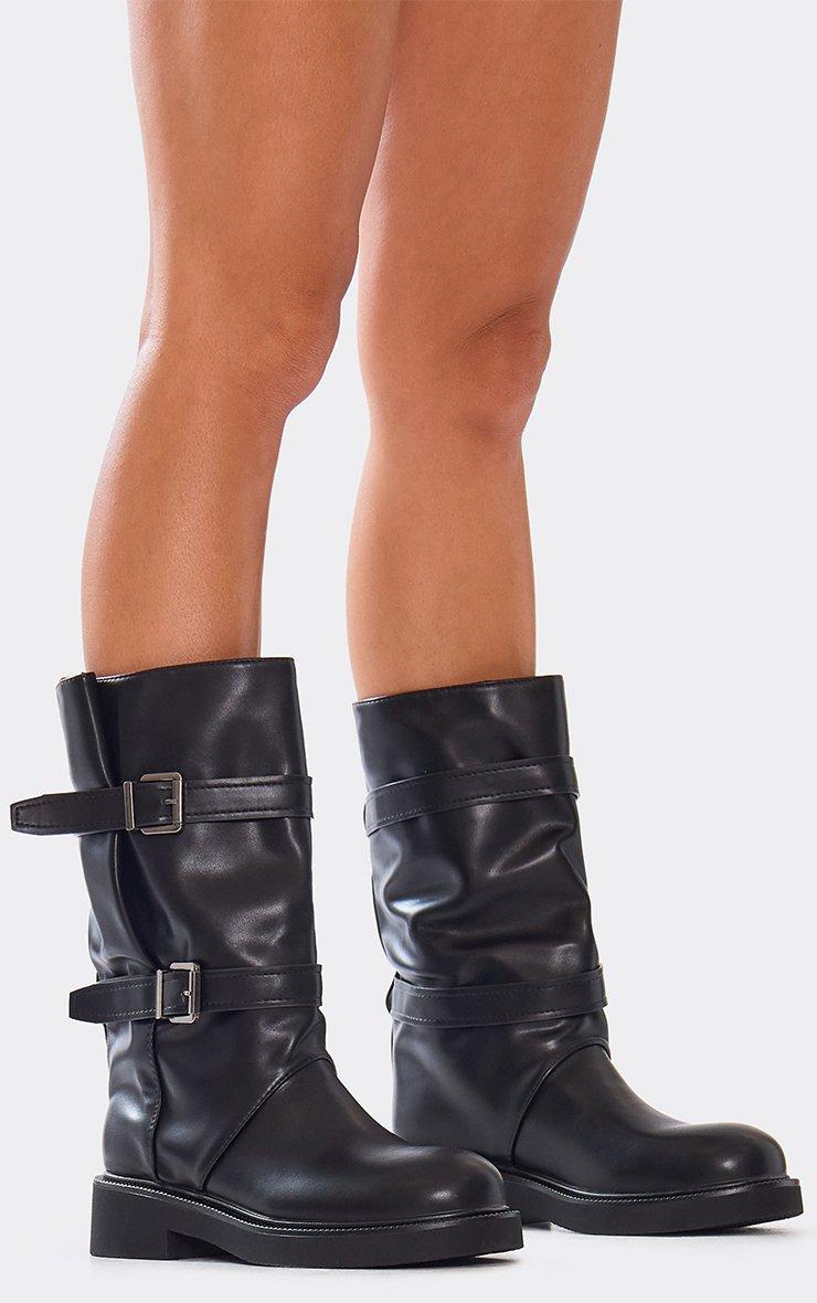 Rulez Double Buckle Mid Calf Biker Boot In Black Faux Leather
