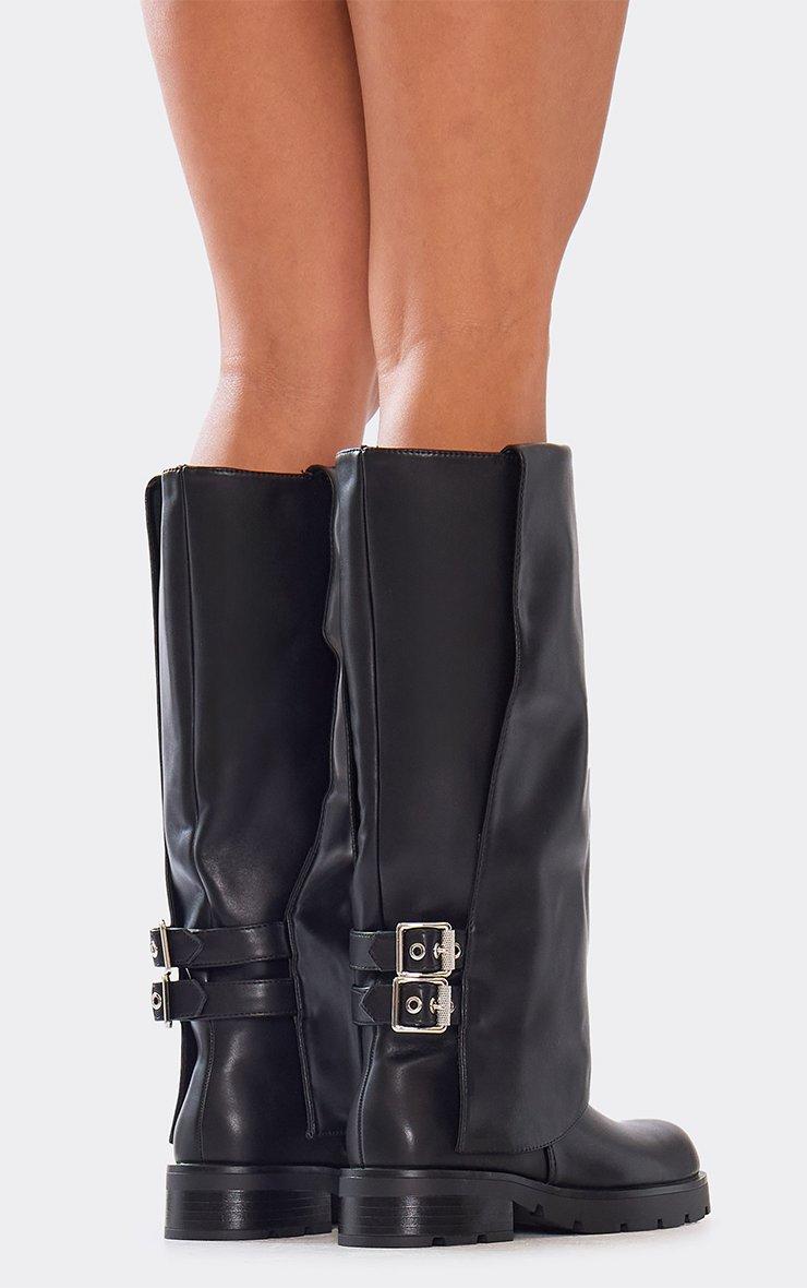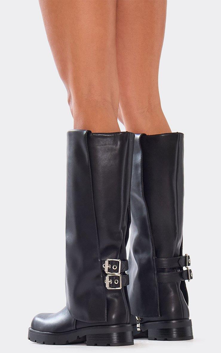 Loved Back Buckle Layered Detail Knee High Biker Boot In Black Faux Leather