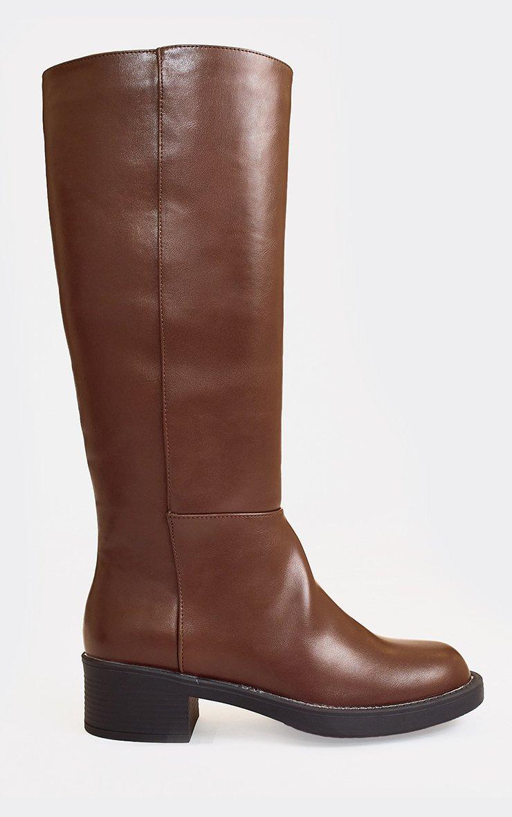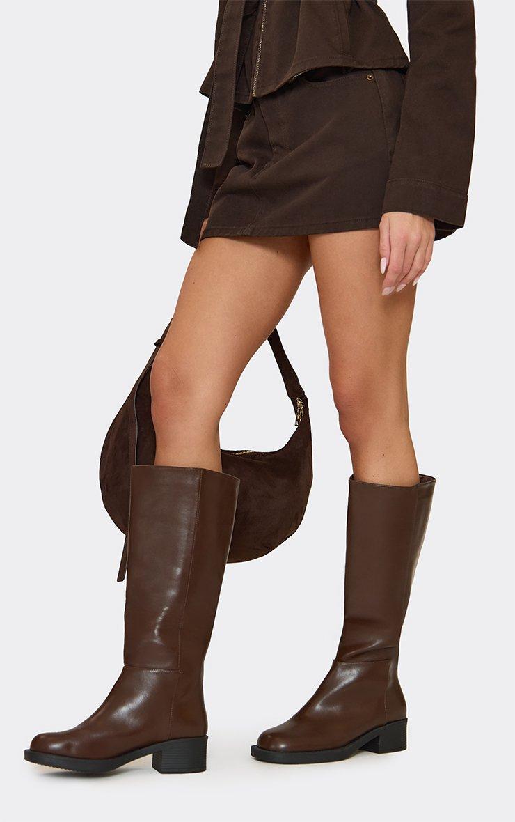 shuffle block heel knee high boot in brown faux leather