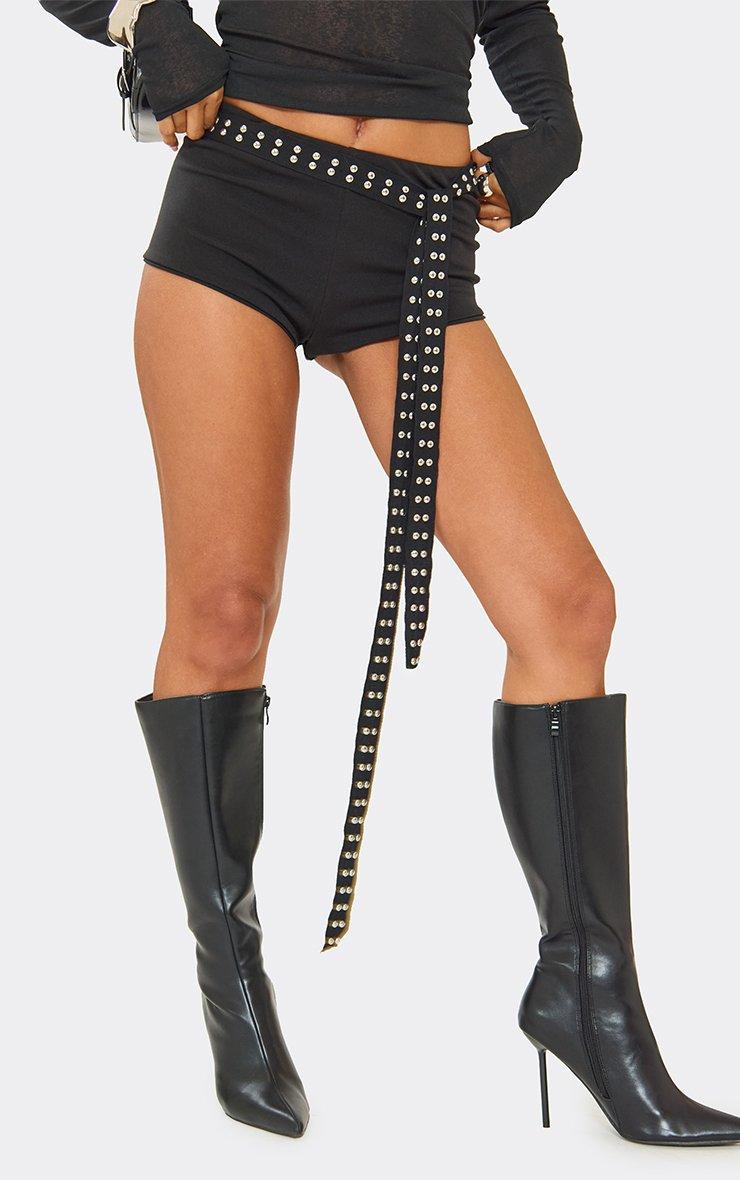 slayer pointed toe stiletto heel knee high boot in black faux leather