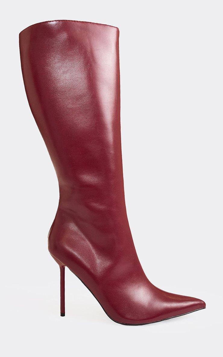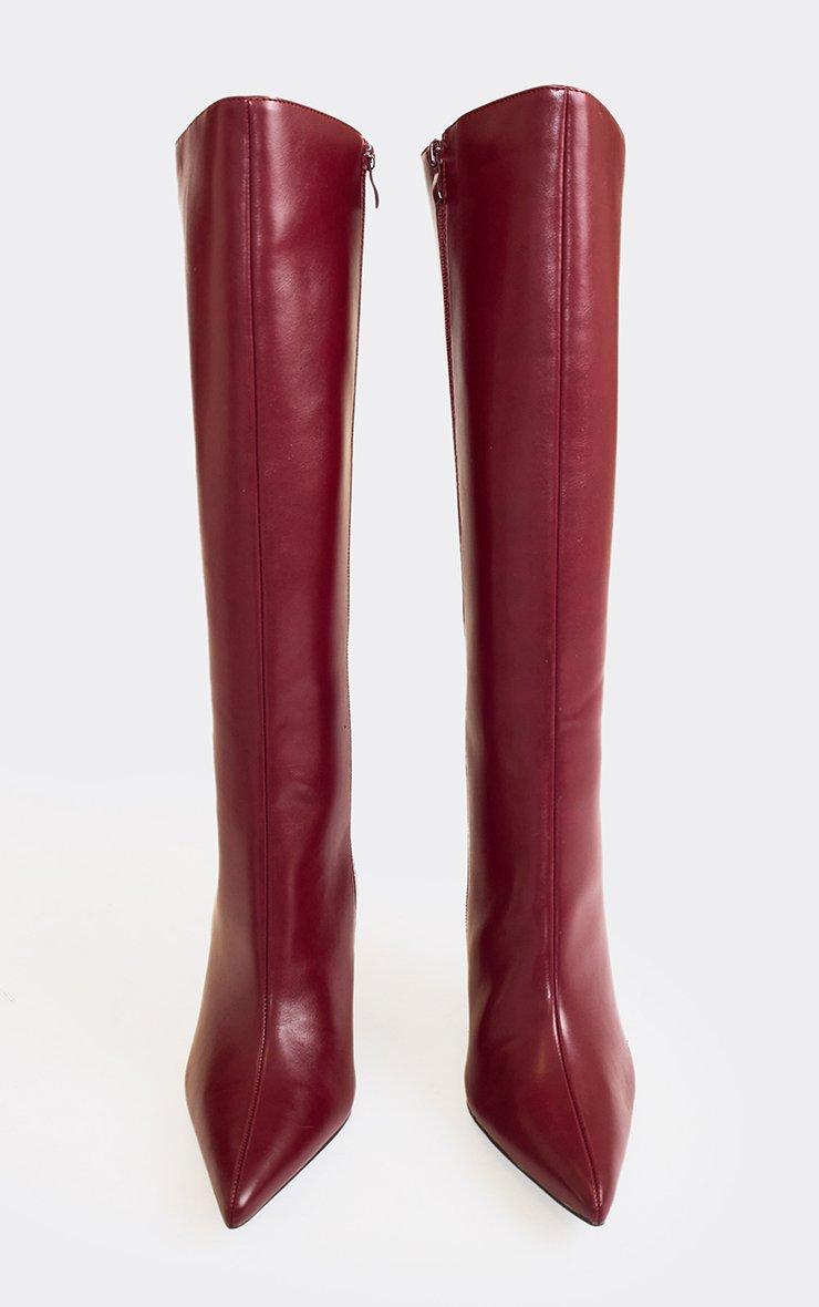 Outstanding Pointed Toe Knee High Heeled Boot In Burgundy Faux Leather
