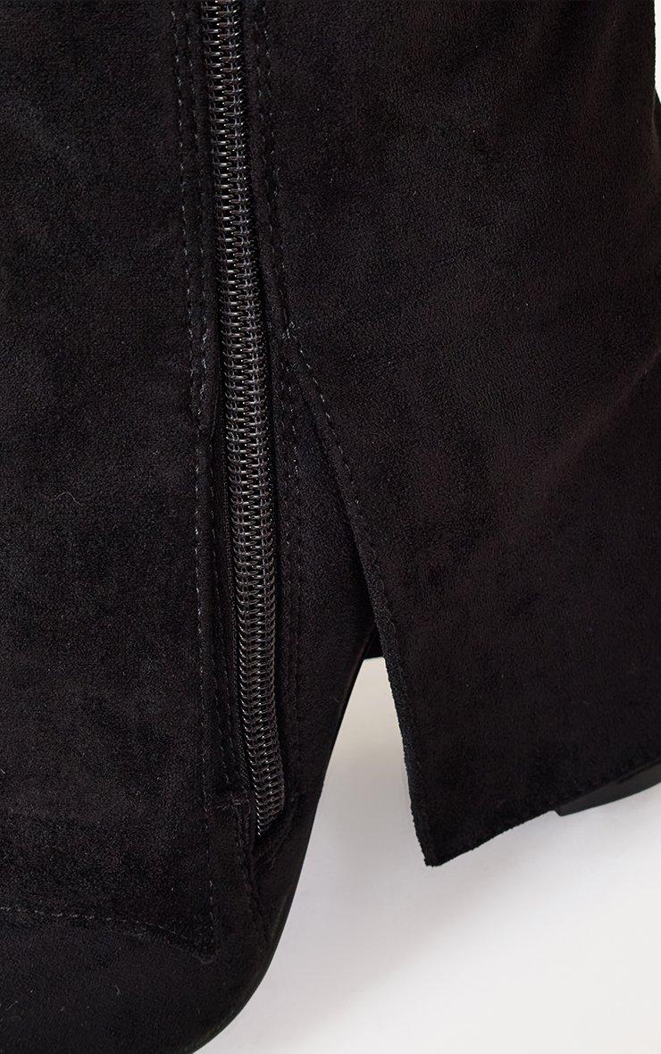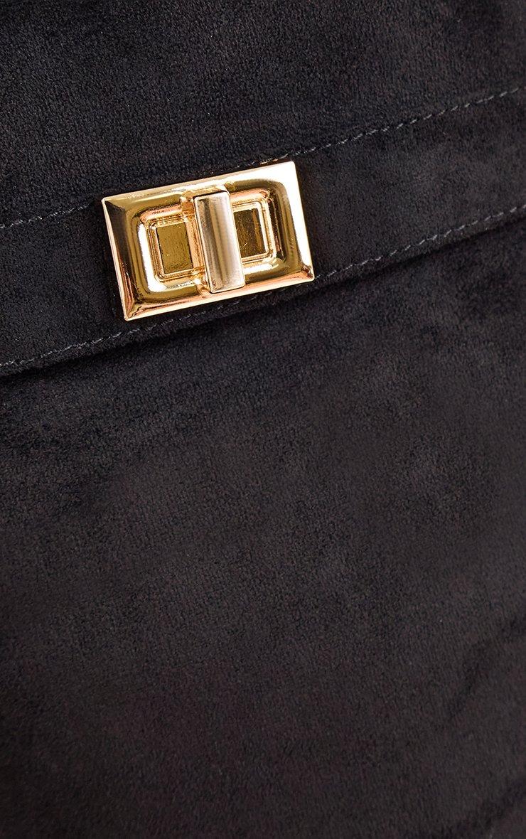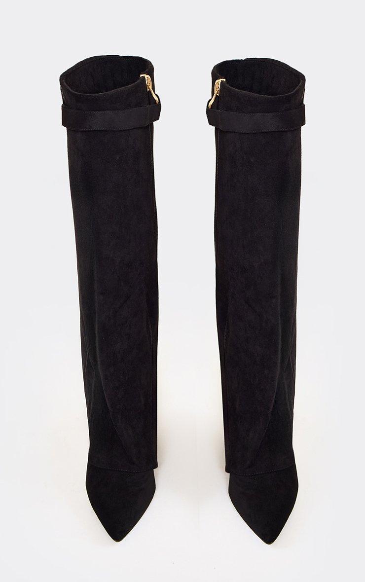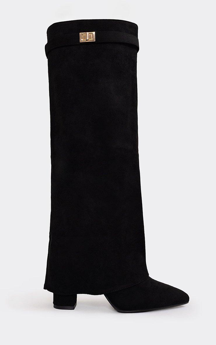 Magic Layered Lock Detail Pointed Toe Block Heel Knee High Boot In Black Faux Suede