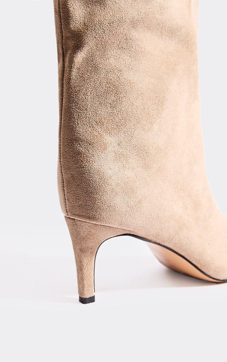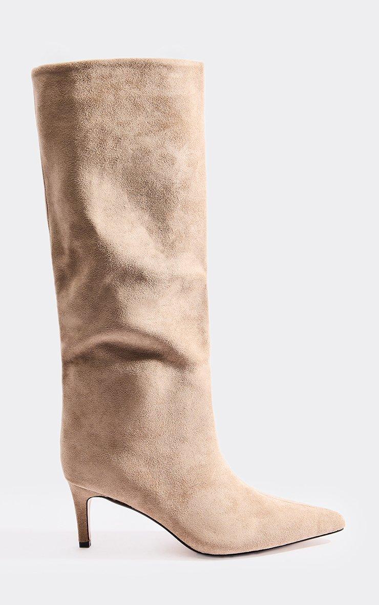 Nightly Pointed Toe Knee High Kitten Heel Boot In Beige Faux Suede