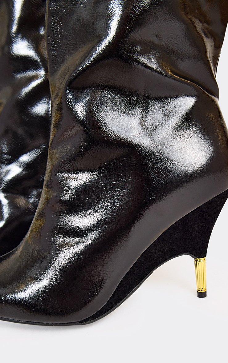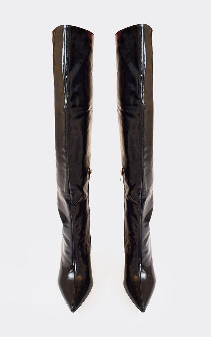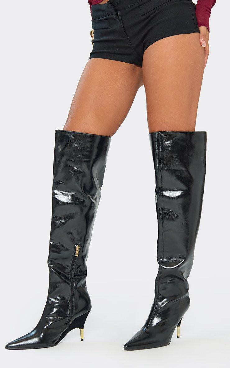 Adapted Pointed Toe Metallic Kitten Heel Knee High Boot In Black Patent