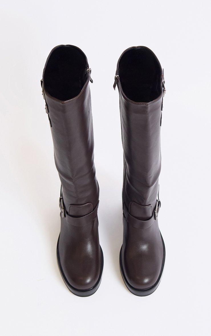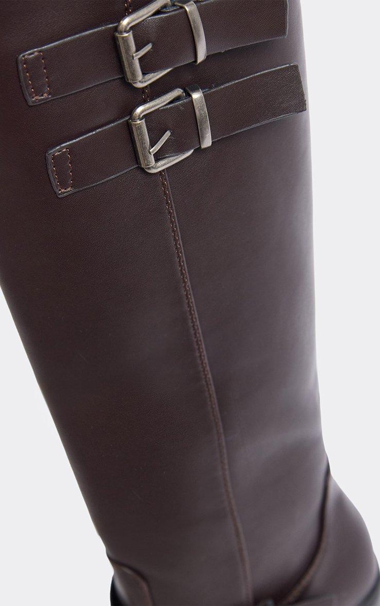 Mona Buckle Detail Knee High Boot In Brown Faux Leather