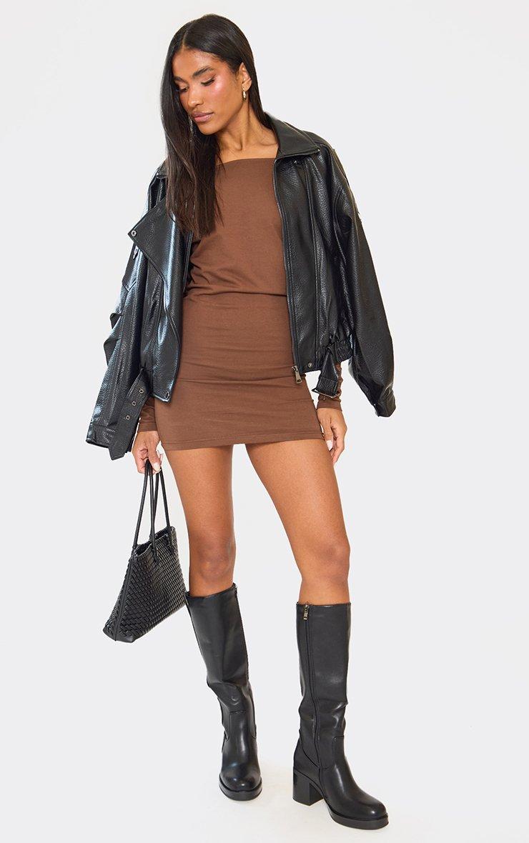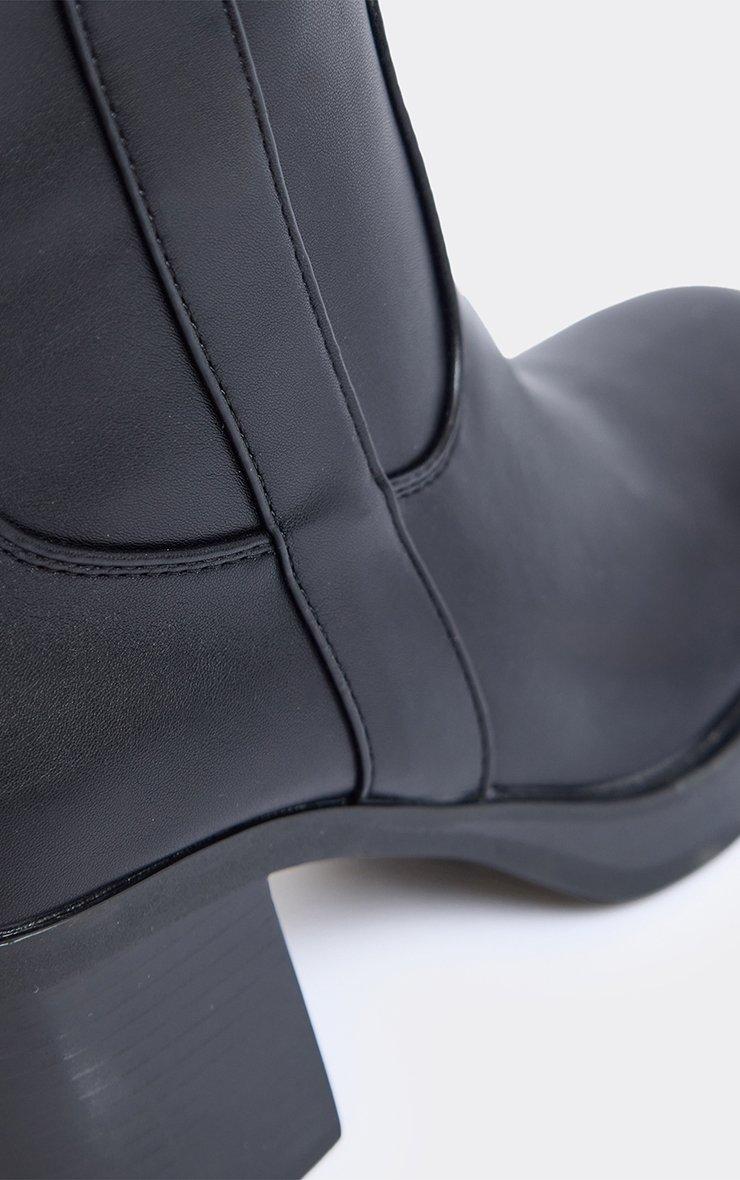 Checker Side Panel Detail Block Heel Knee High Boot In Black Faux Leather