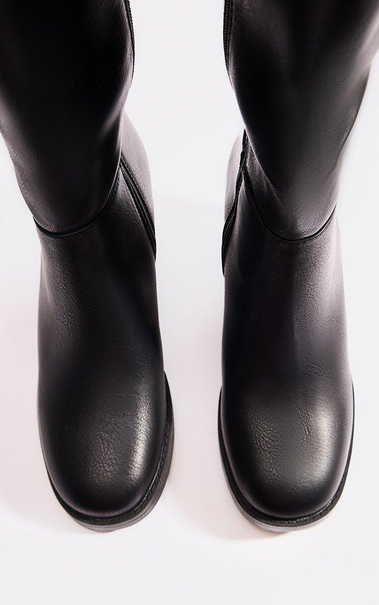 Munchie Block Heel Knee High Long Boot In Black Faux Leather