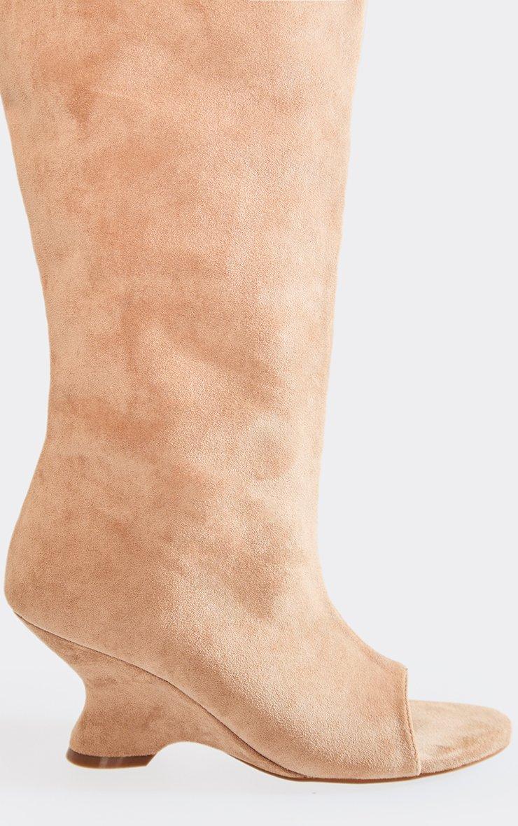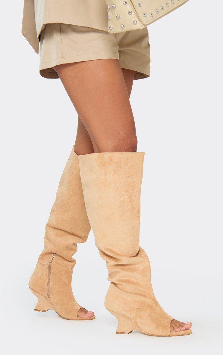Guilty Peep Toe Slouched Stiletto Heel Knee High Boot In Sand Faux Suede