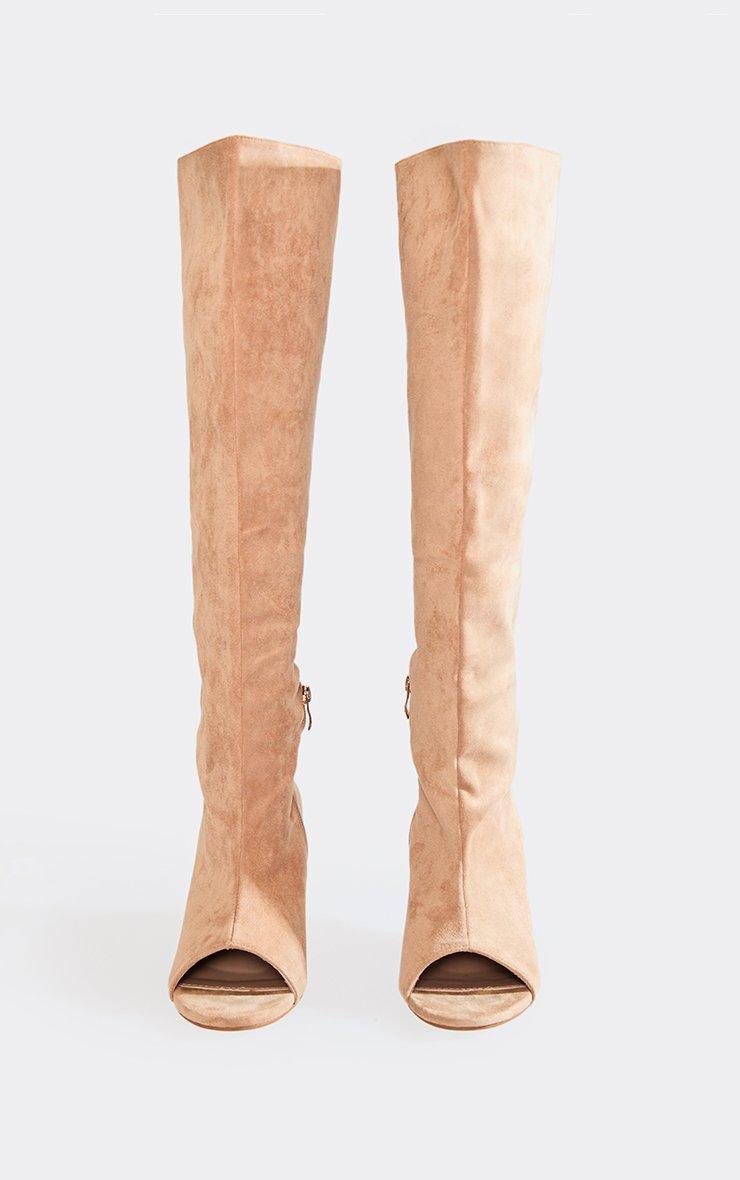 Stun Block Heel Knee High Boot In Beige Faux Suede