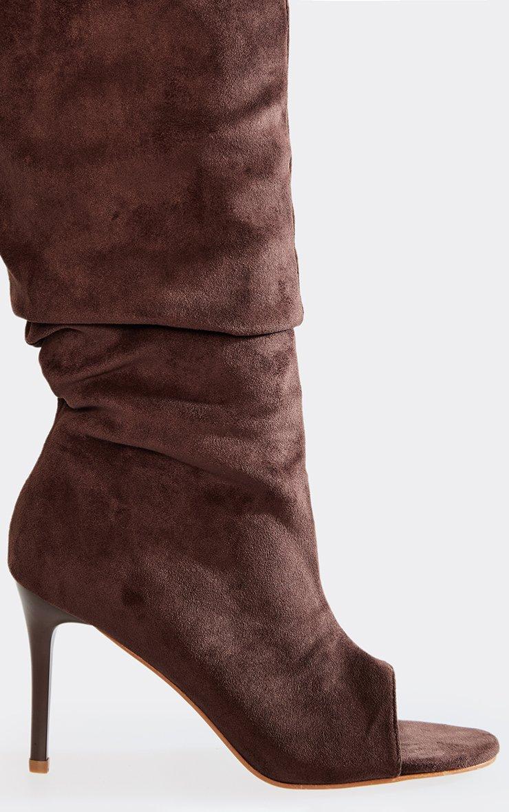 Guilty Peep Toe Slouched Stiletto Heel Knee High Boot In Brown Faux Suede