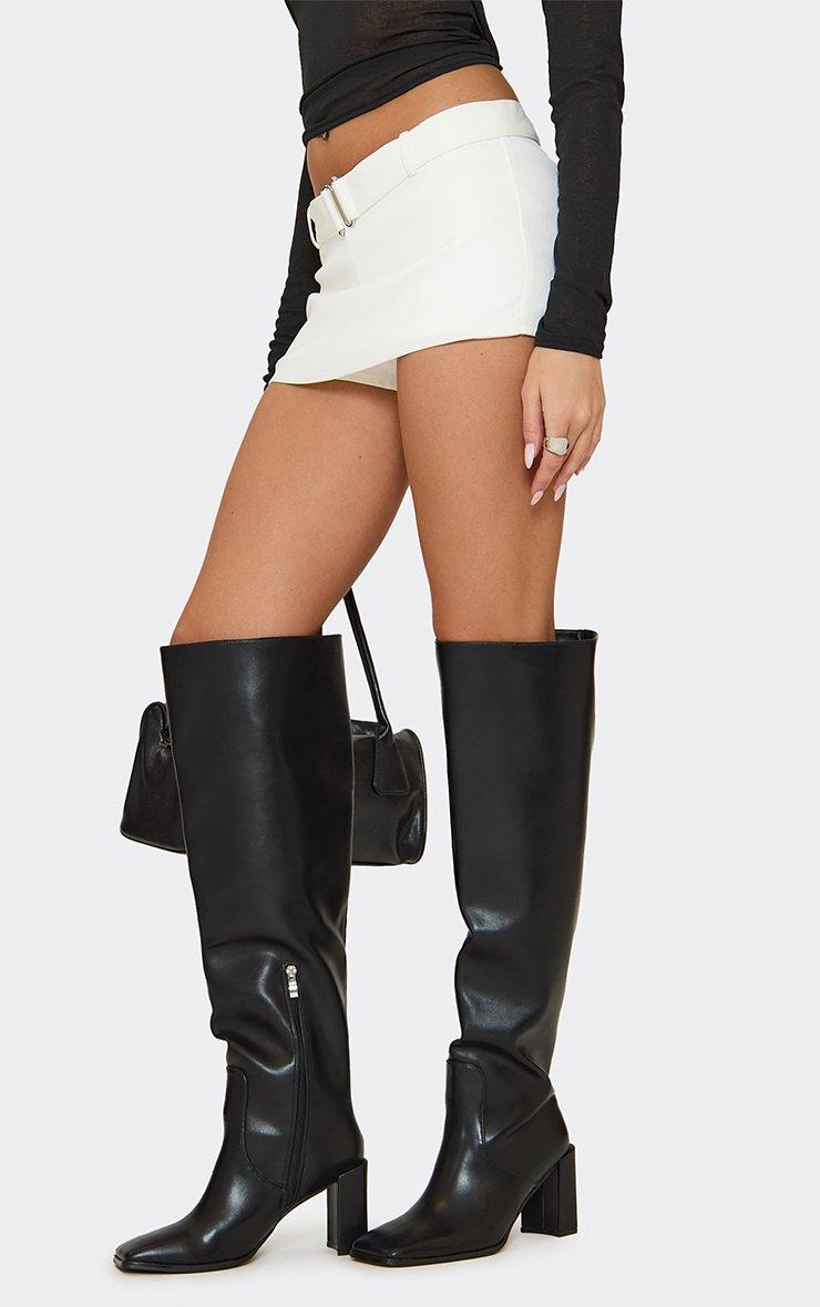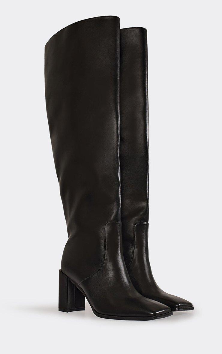 Bertha Square Toe Block Heel Over The Knee Thigh High Boot In Black Faux Leather