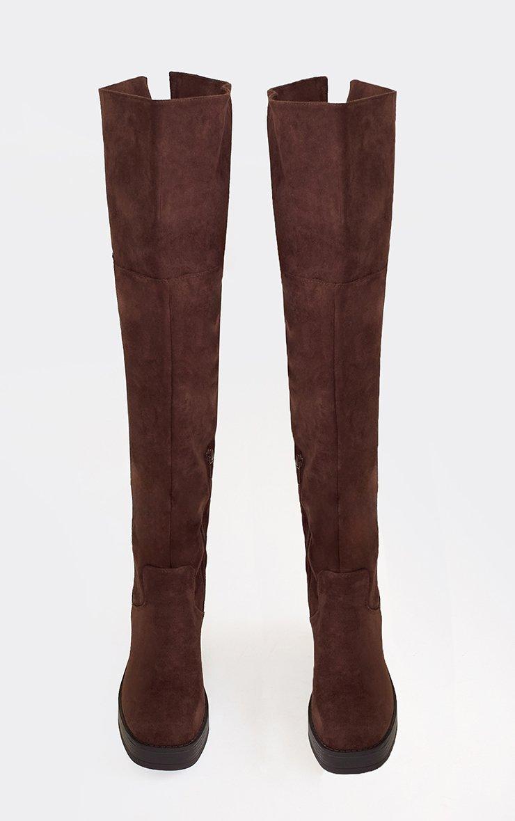 Rev Peep Toe Knee High Wedge Boot In Brown Faux Suede.