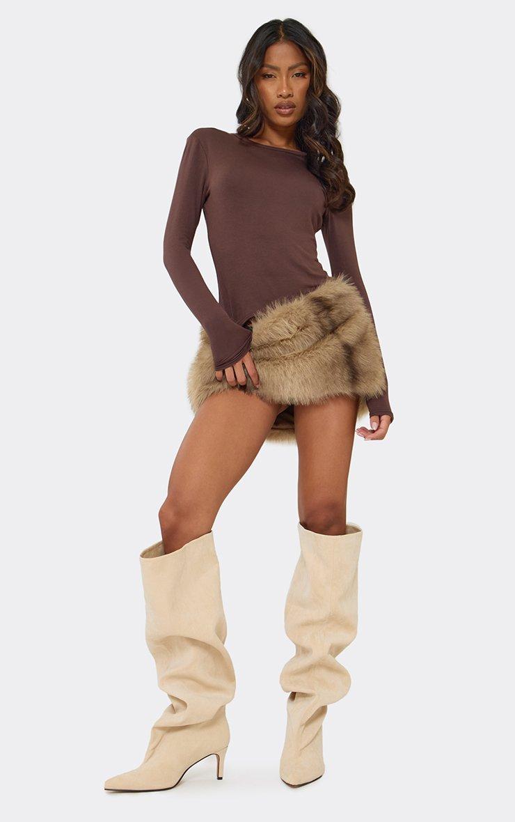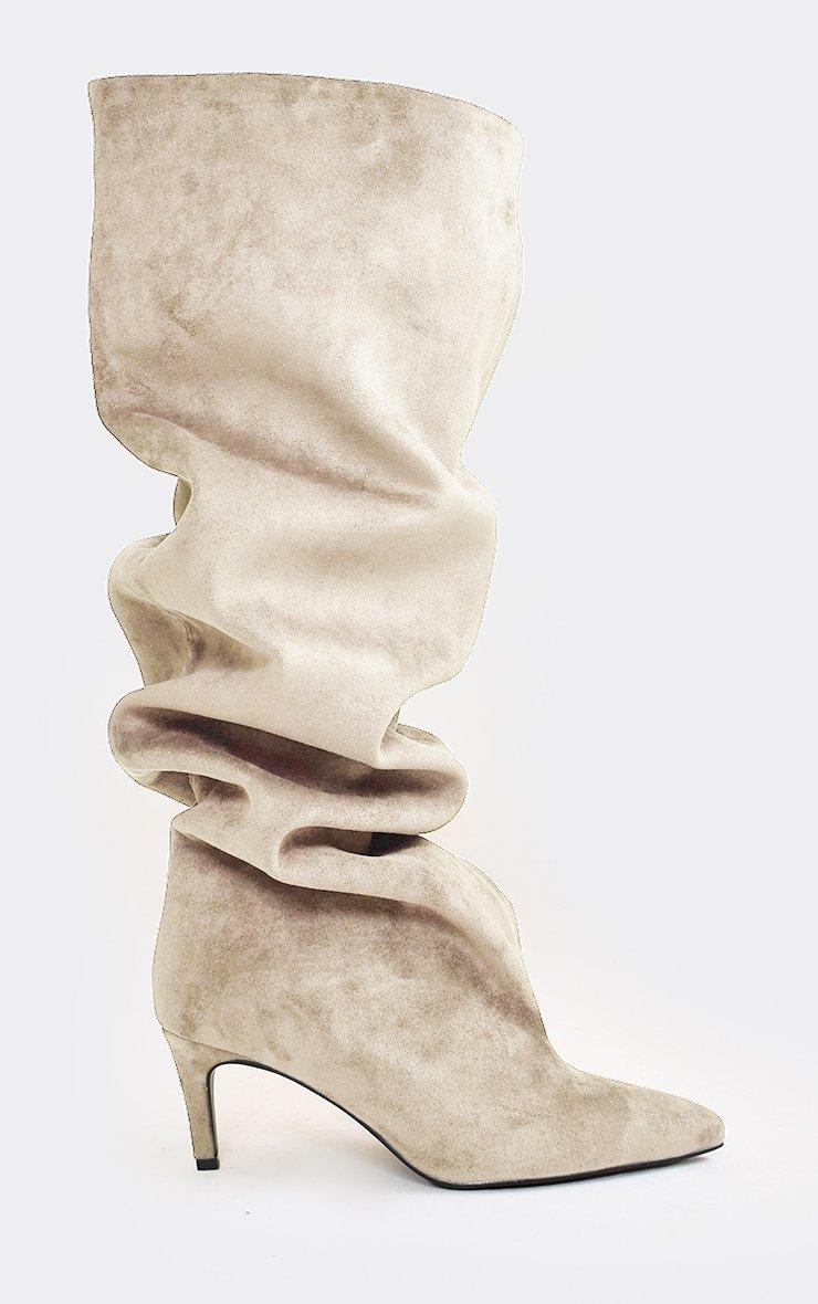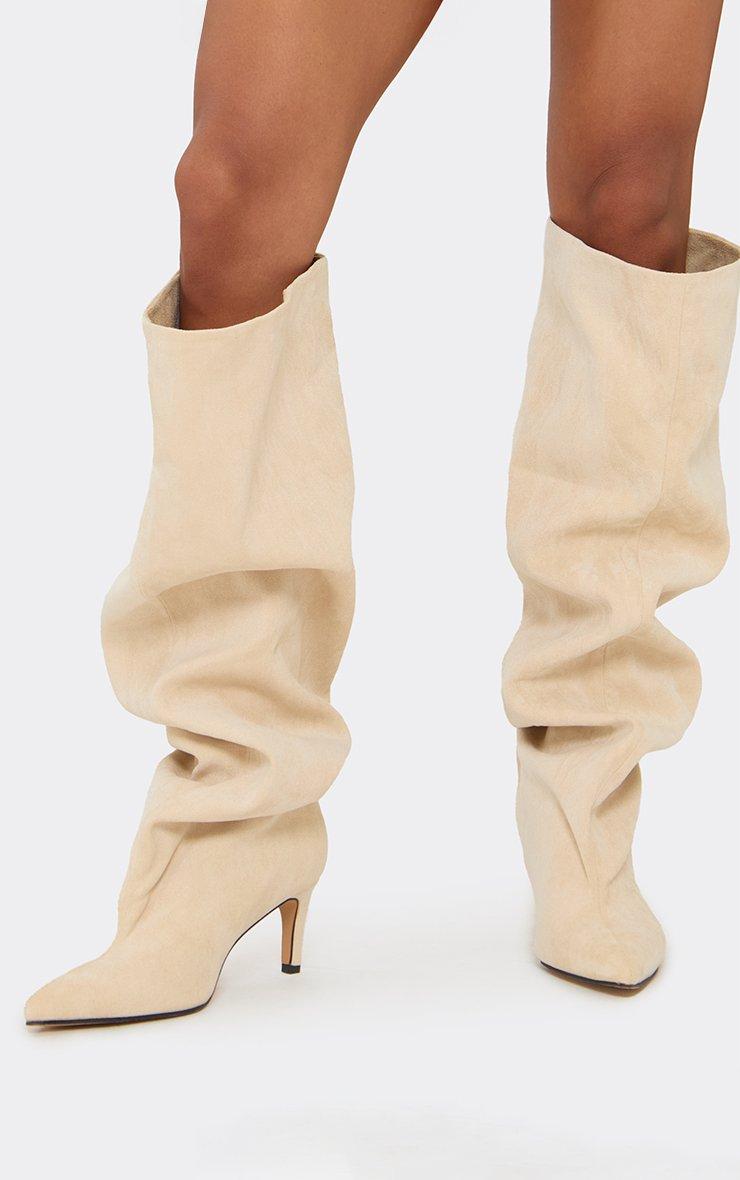 bride pointed toe knee high kitten heel boot in beige faux suede