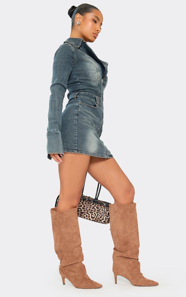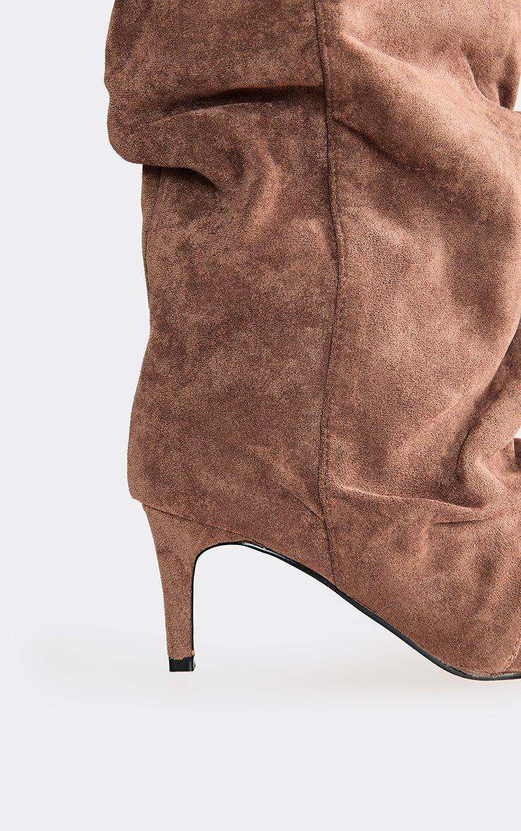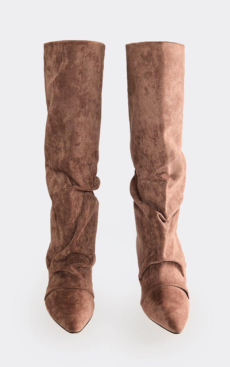 Cave Pointed Toe Slouched Detail Knee High Boot In Brown Faux Suede