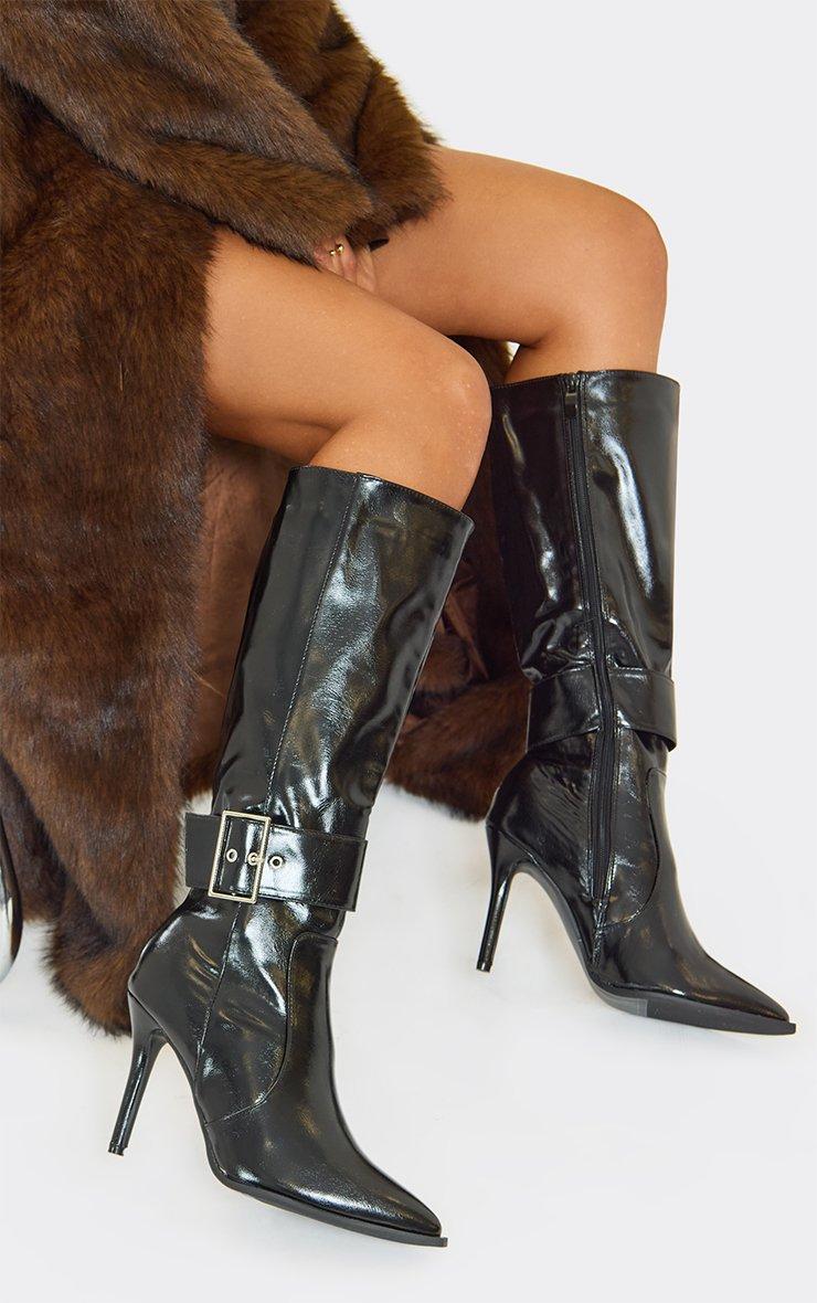effie buckle detail pointed toe stiletto heel knee high boot in black faux leather