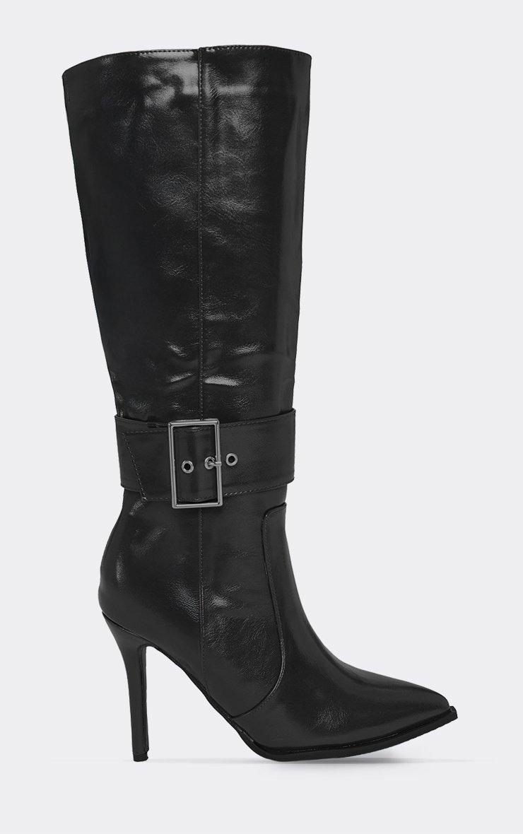 Effie Buckle Detail Pointed Toe Stiletto Heel Knee High Boot In Black Faux Leather