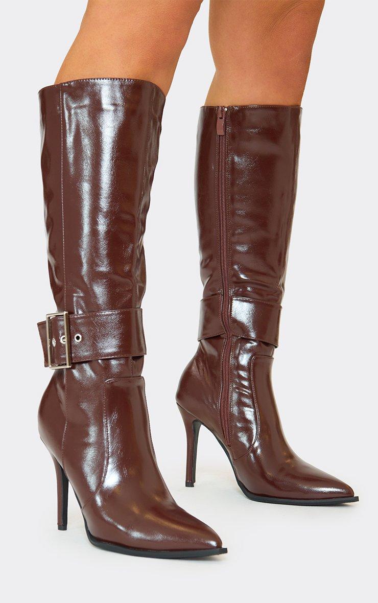 Effie Buckle Detail Pointed Toe Stiletto Heel Knee High Boot In Brown Faux Leather