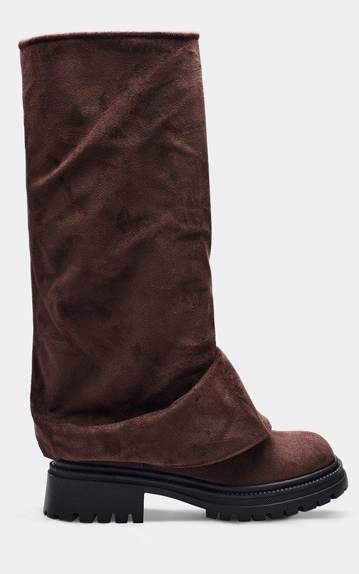 Margot Layered Detail Knee High Long Biker Boot In Brown Faux Suede